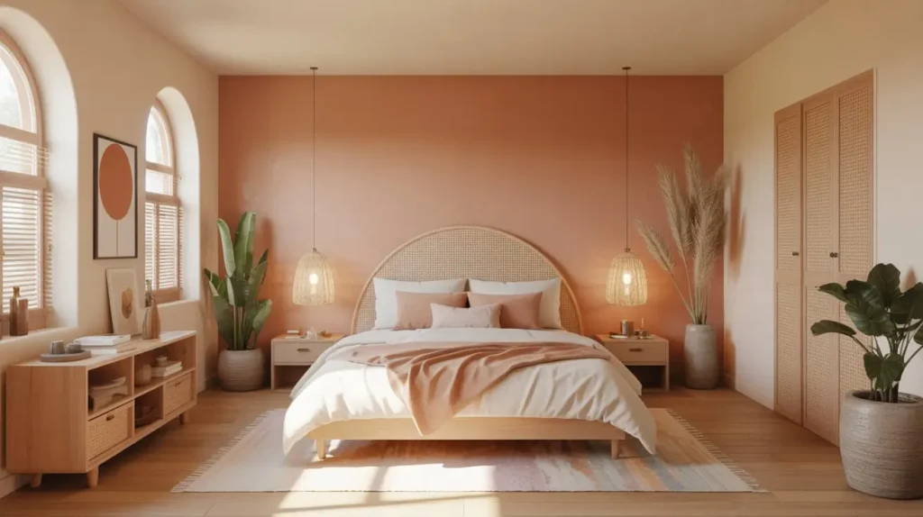 The color works because it’s earthy and grounding. It doesn’t feel artificial or aggressive like some orange tones can. Instead, it creates this warm, inviting atmosphere that makes your bedroom feel like a retreat.