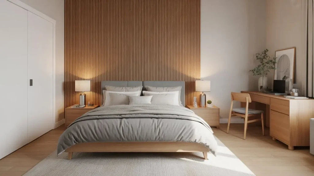 Nothing says “I have my life together” quite like a Scandinavian-inspired bedroom. Vertical wood slats bring that clean, minimalist Nordic vibe while adding warmth that painted walls just can’t match.