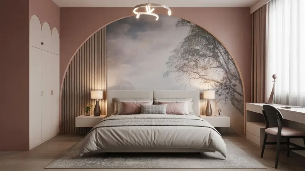The arch design can be as simple or complex as you want. A single large arch painted behind your bed creates a headboard effect. Multiple overlapping arches create a Moroccan or Mediterranean vibe. You can paint the arch in a contrasting color or use the same color in different shades for subtlety.