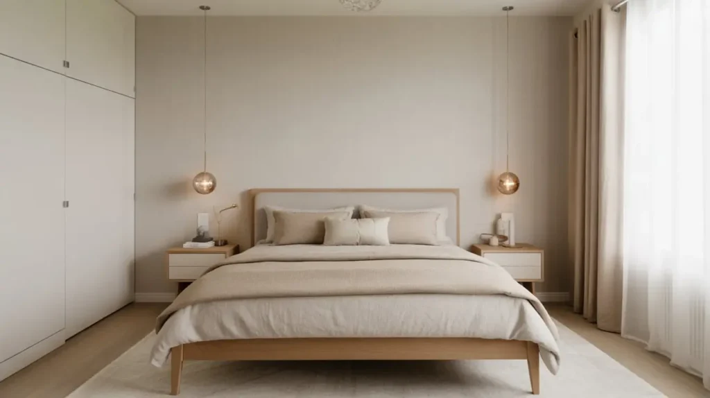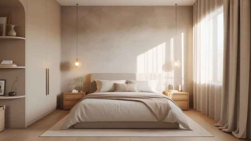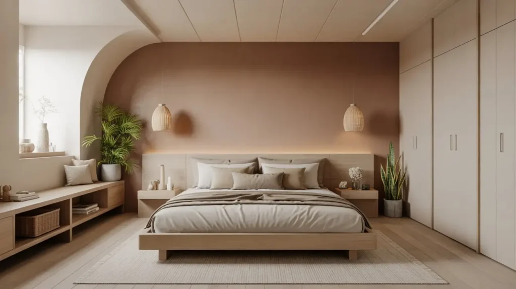 Japandi is what happens when Japanese minimalism meets Scandinavian functionality, and I’m here for it. An earth-tone accent wall in shades of warm taupe, clay, or soft brown creates the perfect backdrop for this aesthetic.