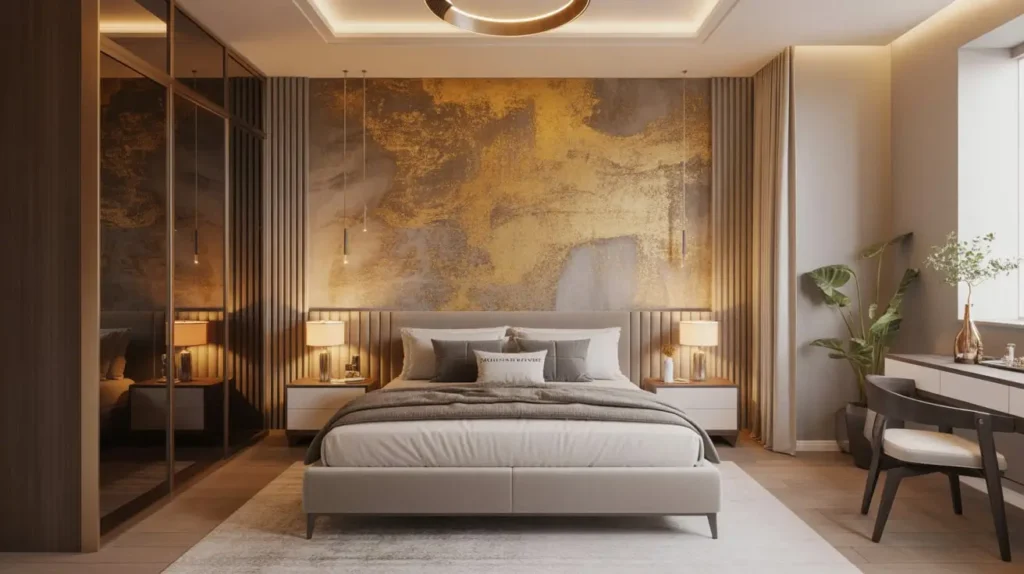 Ready to go full glam? A metallic gold abstract accent wall brings drama, luxury, and personality all at once. This isn’t subtle—it’s a statement piece that demands attention.