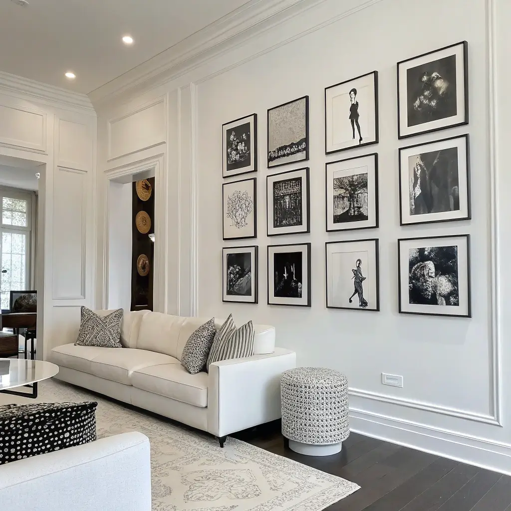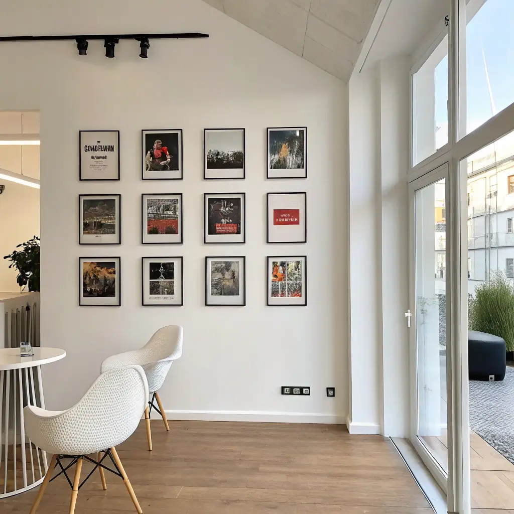 - Mix frame colors (black, white, natural wood)