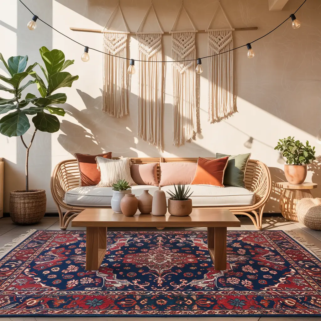 - Natural materials: rattan chairs, jute rugs, wooden coffee tables