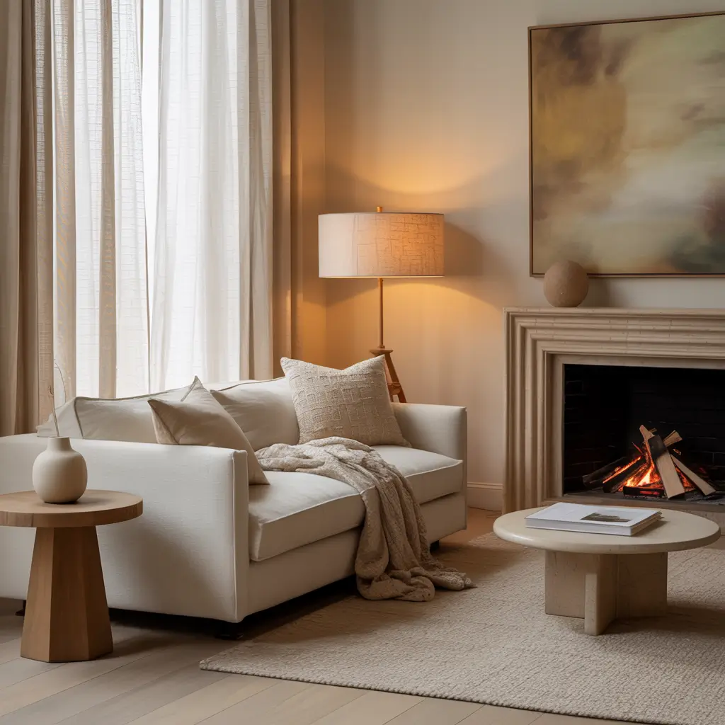 - Neutral color palette with warm undertones (think cream, warm gray, soft taupe)