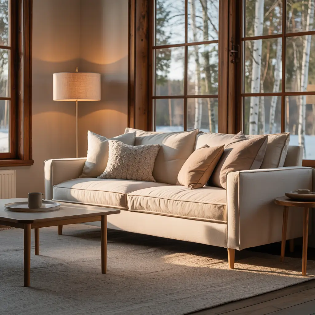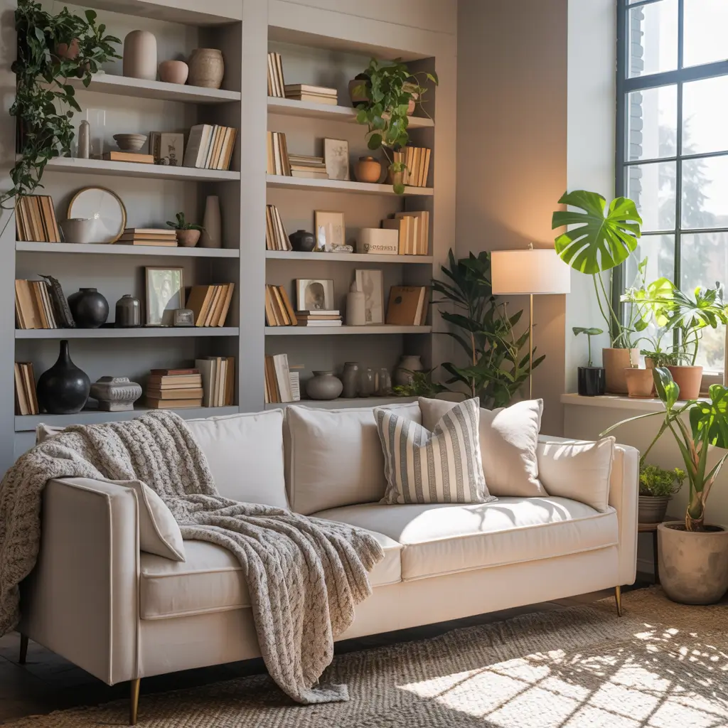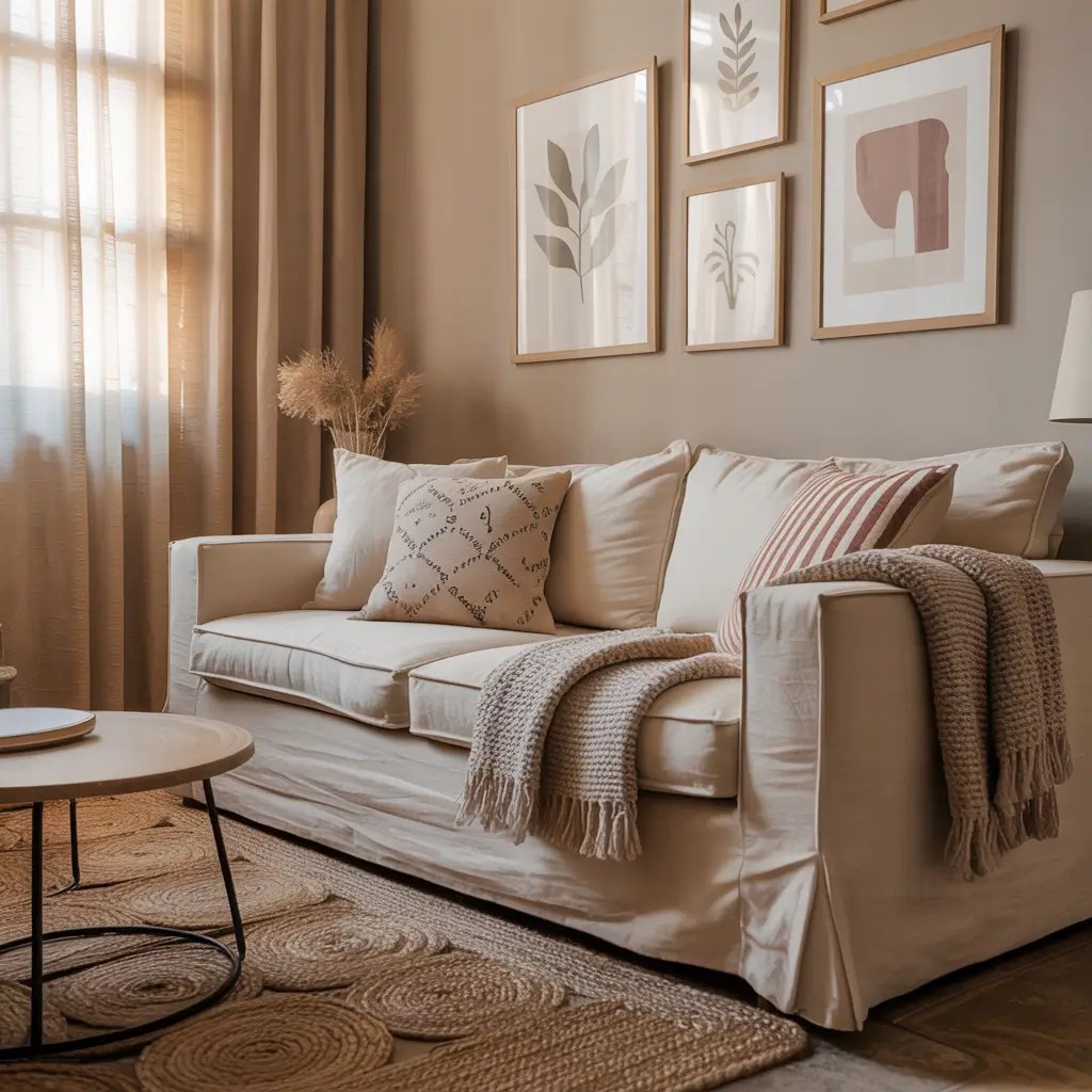 - Neutral base with warm accents: Creams, beiges, and soft grays work beautifully