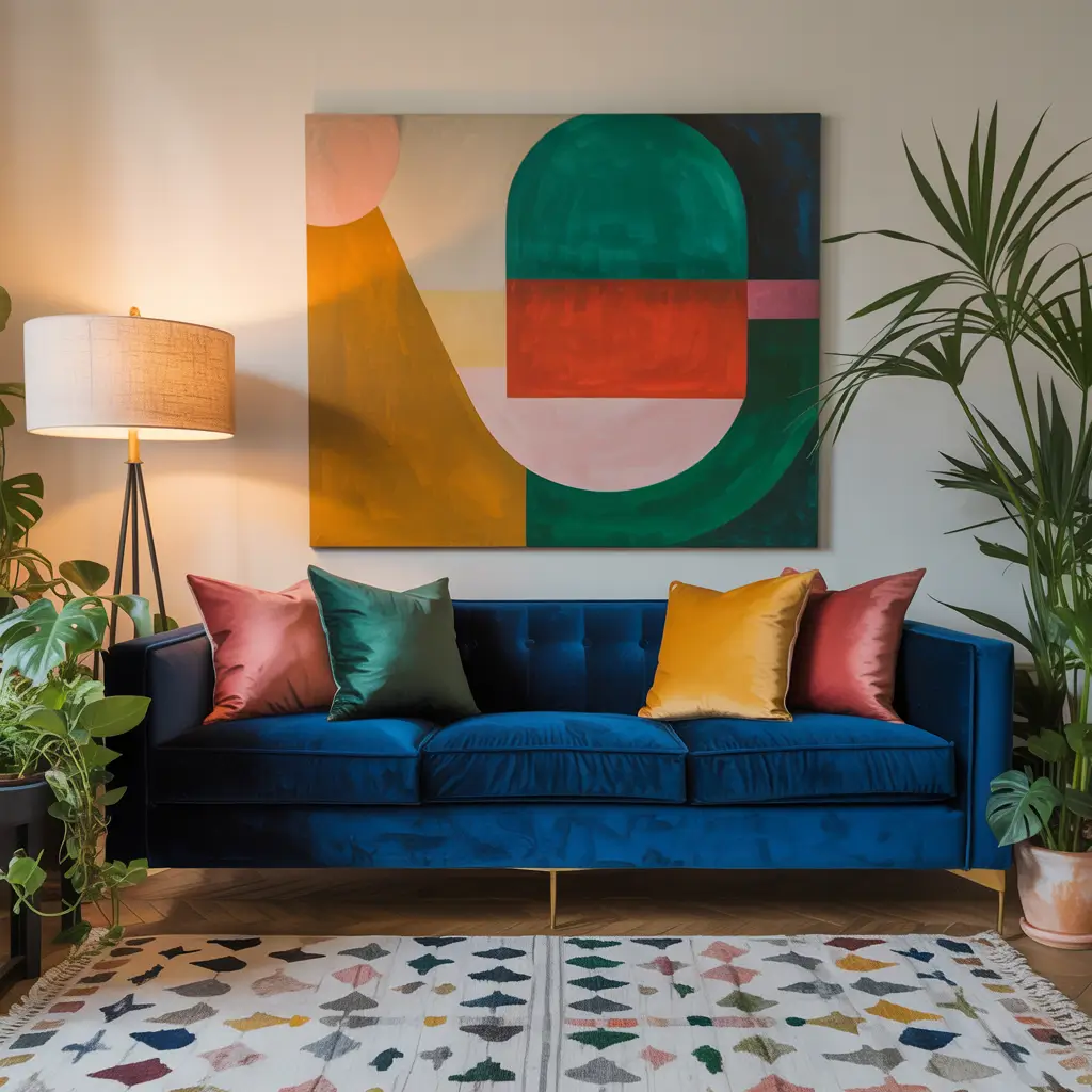 - Vibrant rug: Anchors the room with color