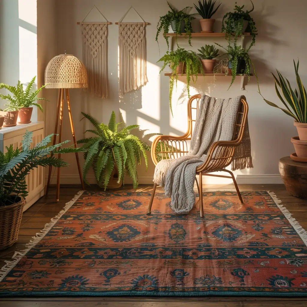 - Mixed textiles: Macramé, woven wall hangings, patterned pillows