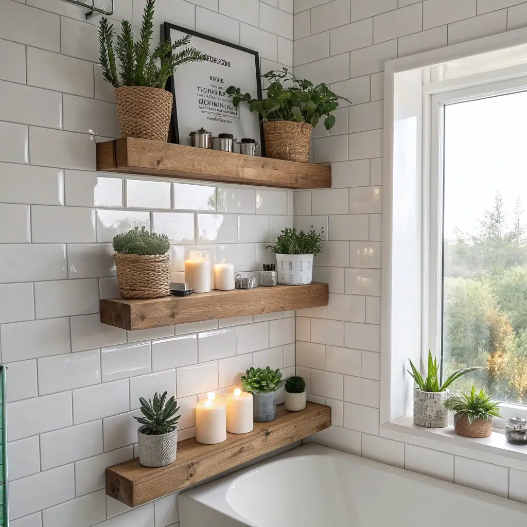 Floating shelves give you storage without eating up floor space — a massive win for small bathrooms. You mount them directly to the wall, and they create this clean, airy look because you don’t see any bulky brackets or hardware. Add a few small potted plants, a succulent or two, and maybe a trailing pothos, and suddenly your bathroom feels like a spa retreat.