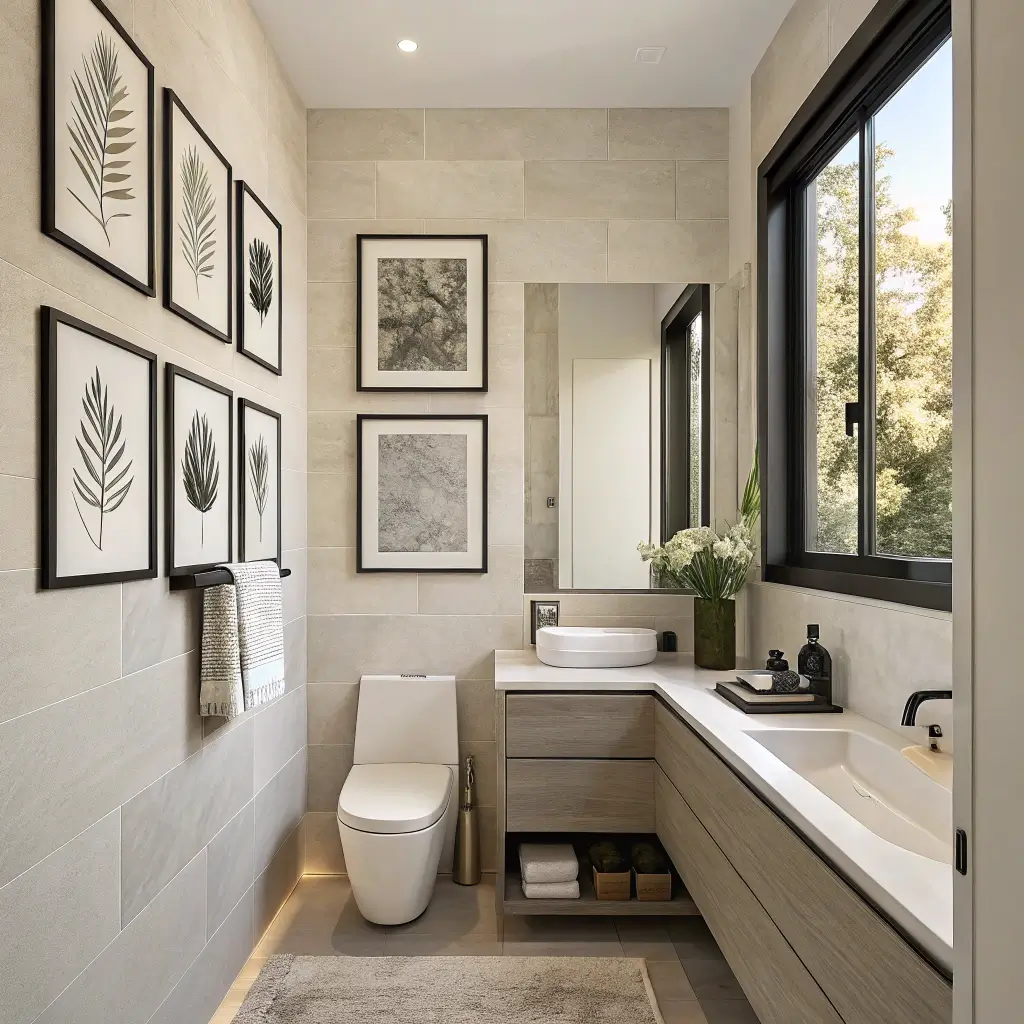 Don’t hang a tiny 5×7 print on a huge empty wall — it’ll look lost. Match your art size to your wall size. A single large print (think 16×20 or bigger) makes a bold statement, while a cluster of smaller prints creates visual interest through arrangement. Hang art at eye level, and if you’re placing it above a toilet or vanity, keep the bottom edge of the frame about six to eight inches above the fixture.