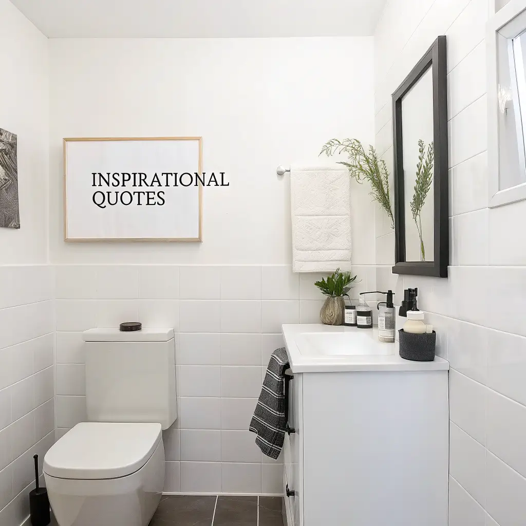 Hang your typography print where guests will see it immediately — the wall facing the toilet is prime real estate for this kind of decor. Size matters here too: a single large canvas (at least 11×14) makes more impact than a tiny print you need to squint to read.