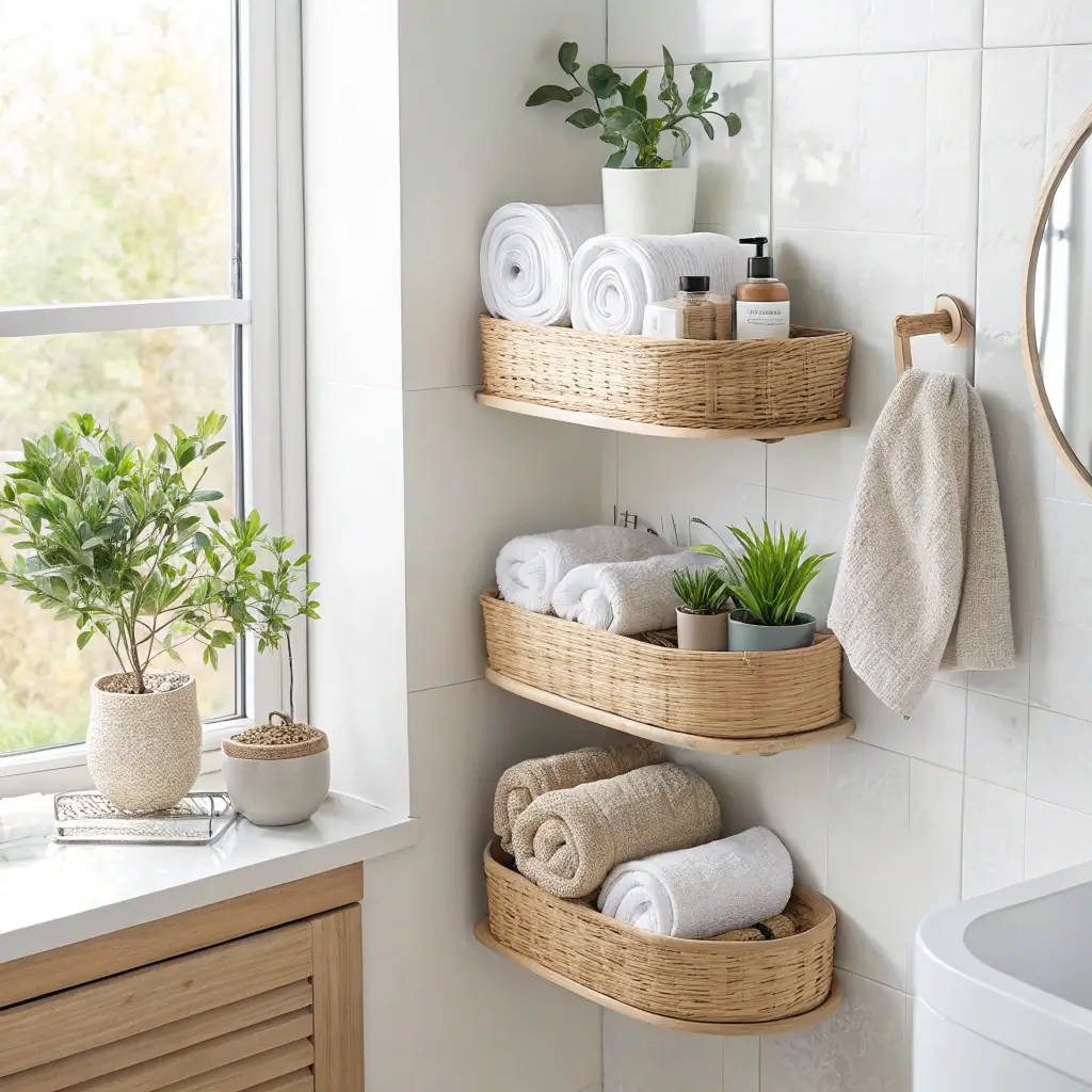 Install two or three baskets vertically in the corner, spacing them about twelve to fourteen inches apart. This creates a vertical display that draws the eye upward and makes ceilings feel taller — a brilliant trick for small bathrooms.