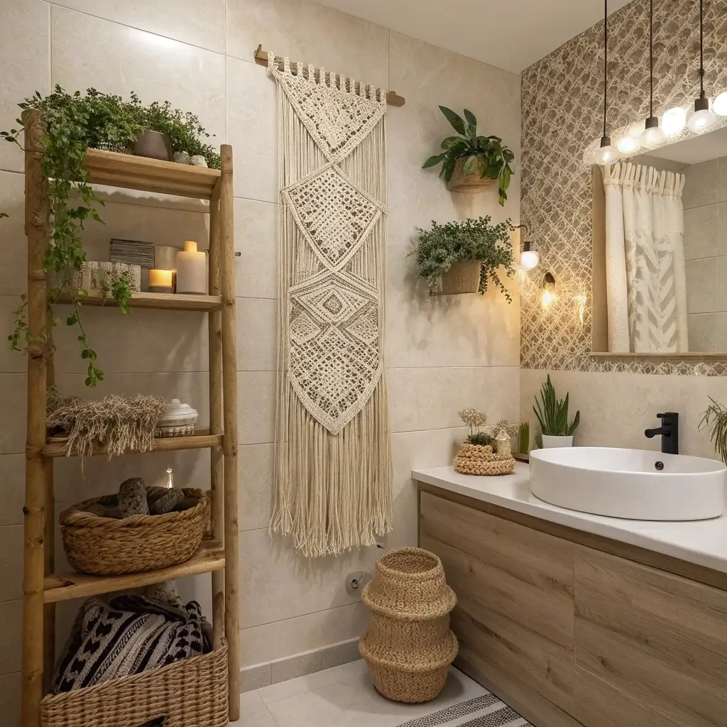 Last but absolutely not least, boho macramé wall hangings bring texture, warmth, and artisanal character to bathroom walls like nothing else. If your bathroom feels cold or sterile, a macramé piece instantly softens the entire space.