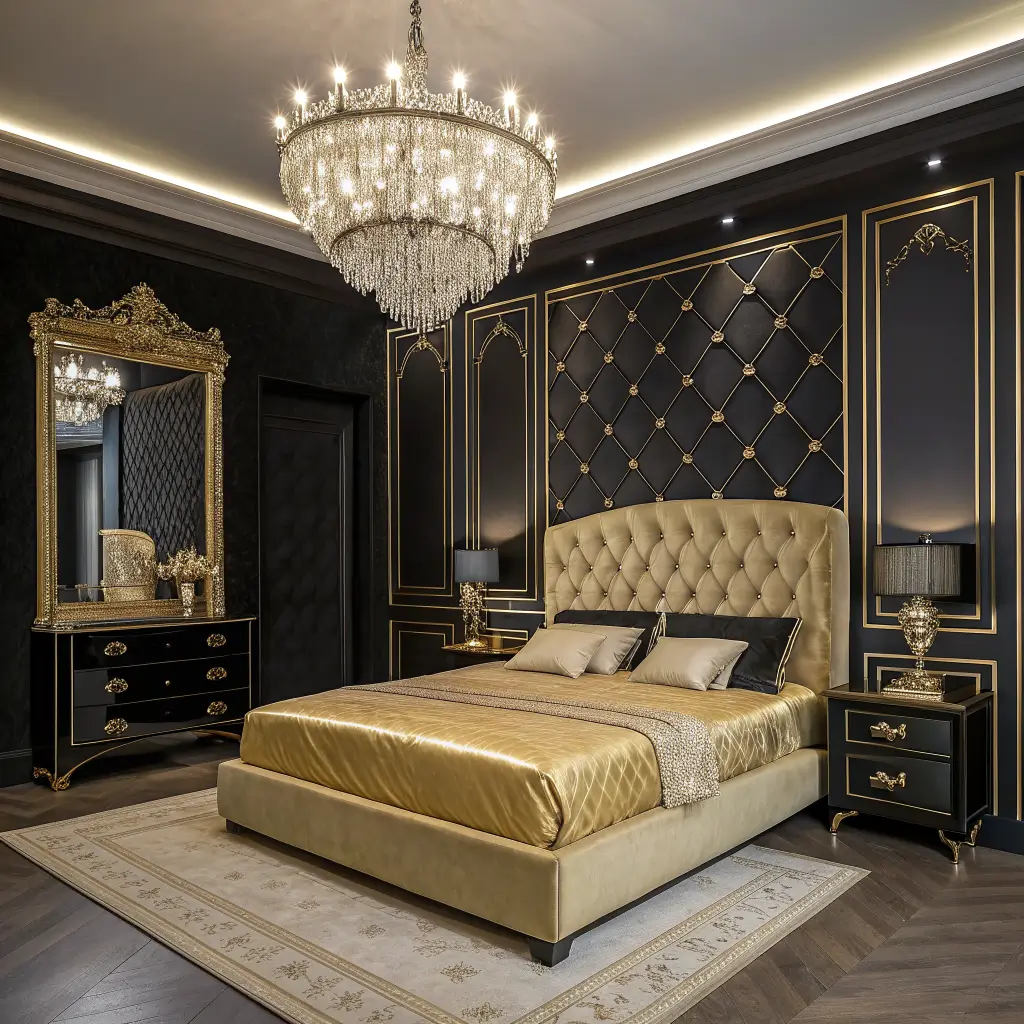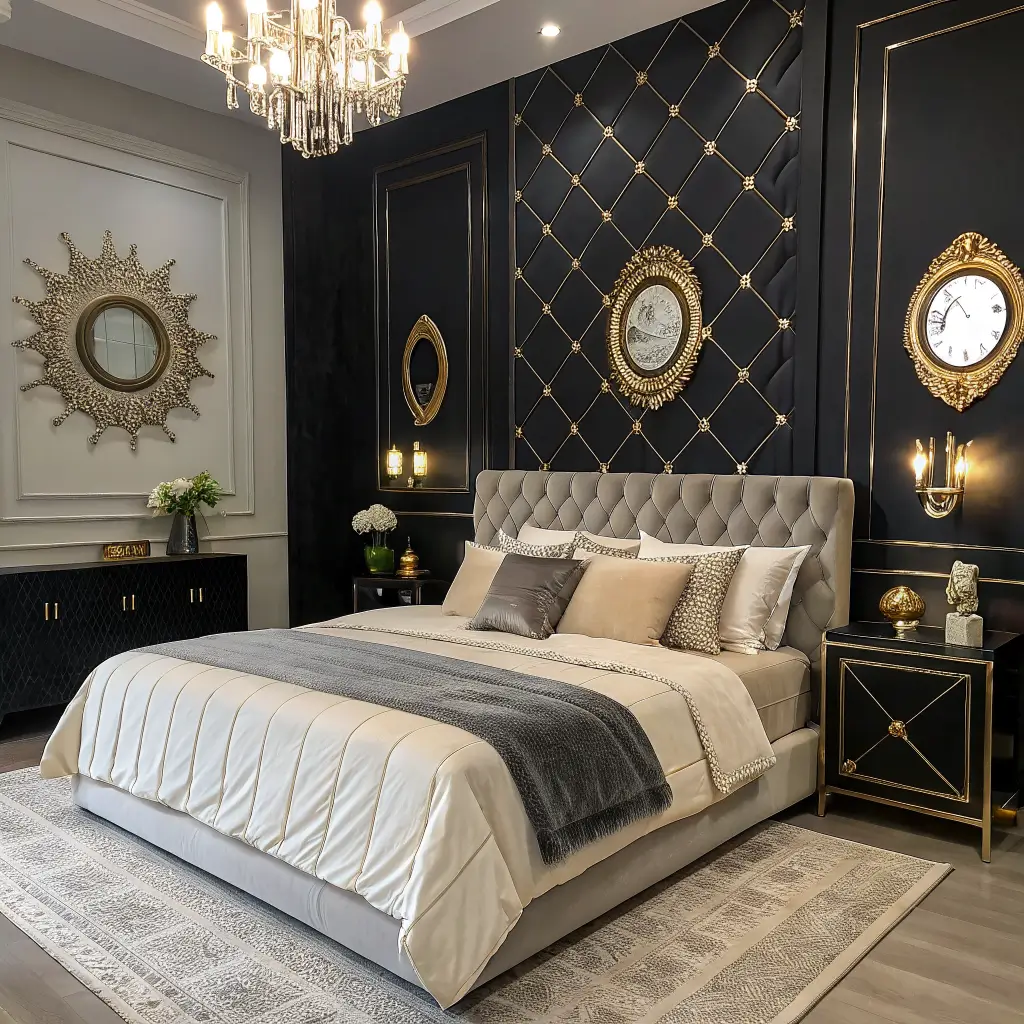 - Black & Gold Glam:ย Balance metallic shine with plush, tactile textures