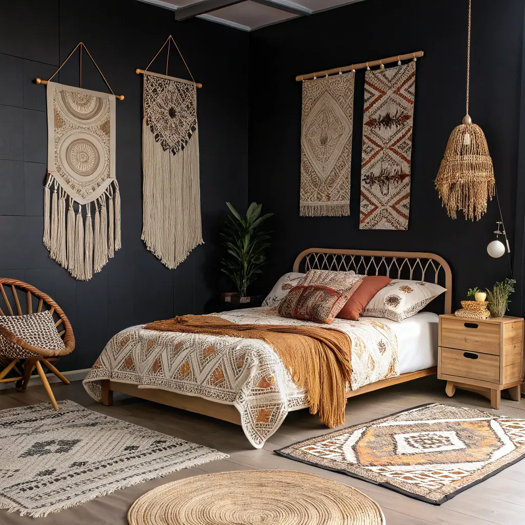 - Cozy Dark Boho:ย Layer earthy tones and natural materials against the dark backdrop