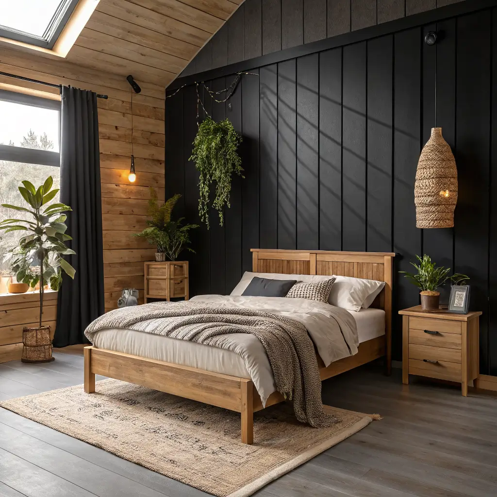 - Reclaimed wood:ย Adds texture and history. A reclaimed wood headboard against a black wall creates a focal point that practically decorates itself.