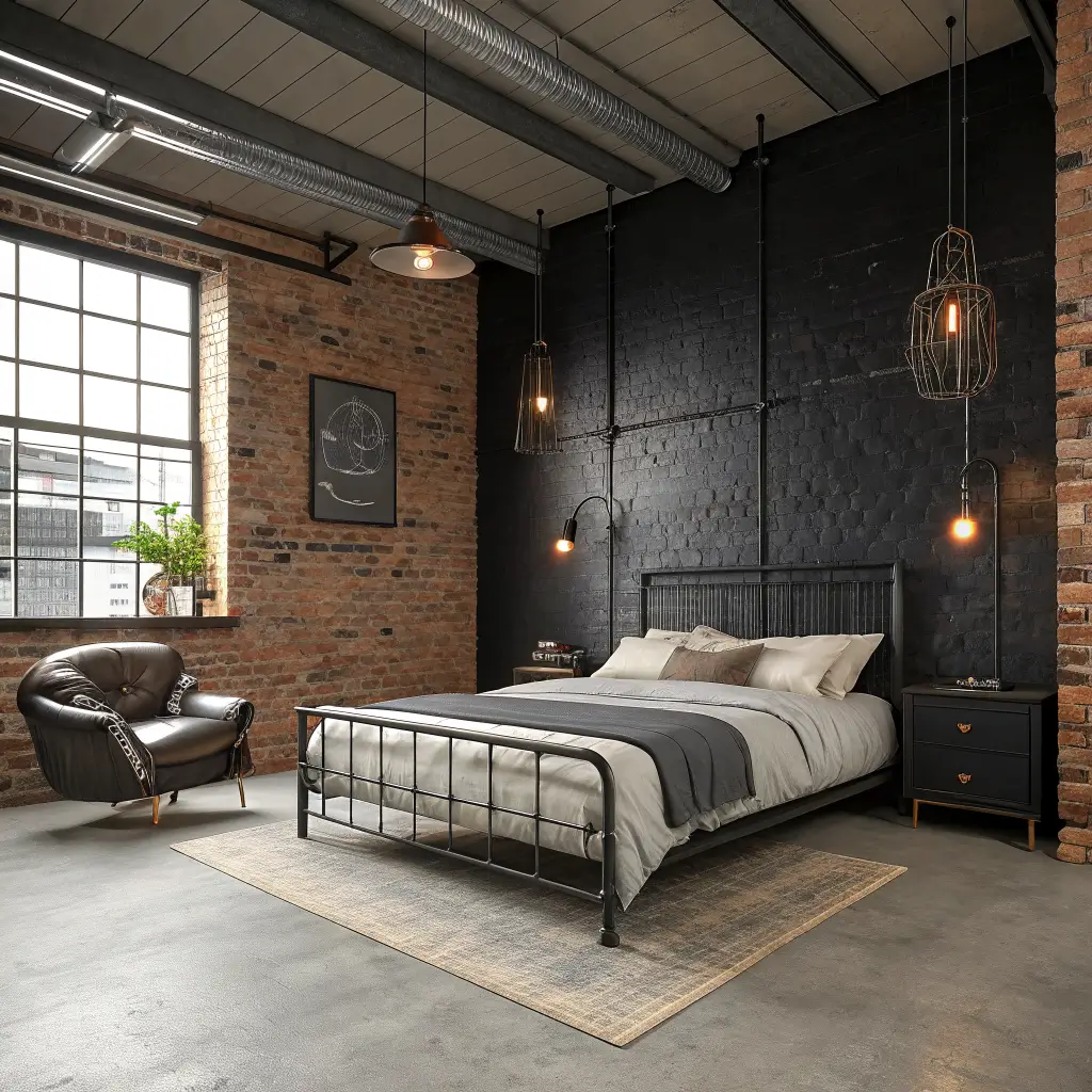 If your style leans toward exposed brick, metal fixtures, and loft-apartment energy, the industrial chic black bedroom is calling your name. Black walls are practically the default backdrop for industrial design, and for good reason โ they mimic the look of old factory spaces and warehouse conversions without you actually having to live in one.