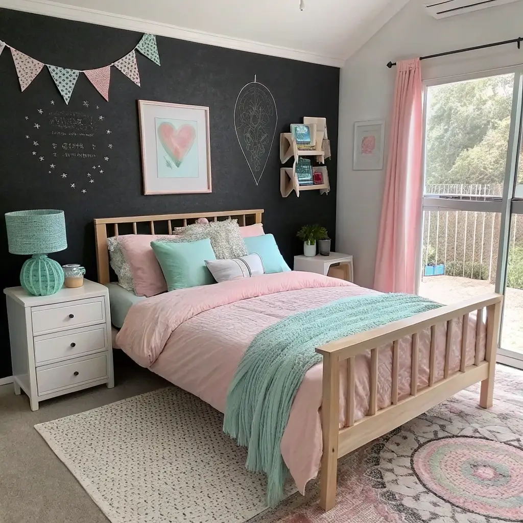 FYI, this combination works exceptionally well in smaller bedrooms. The black wall adds depth and perceived dimension, while the pastels keep the room feeling light and open. It’s genuinely one of the best ways to make a compact bedroom feel both cozy and spacious at the same time.