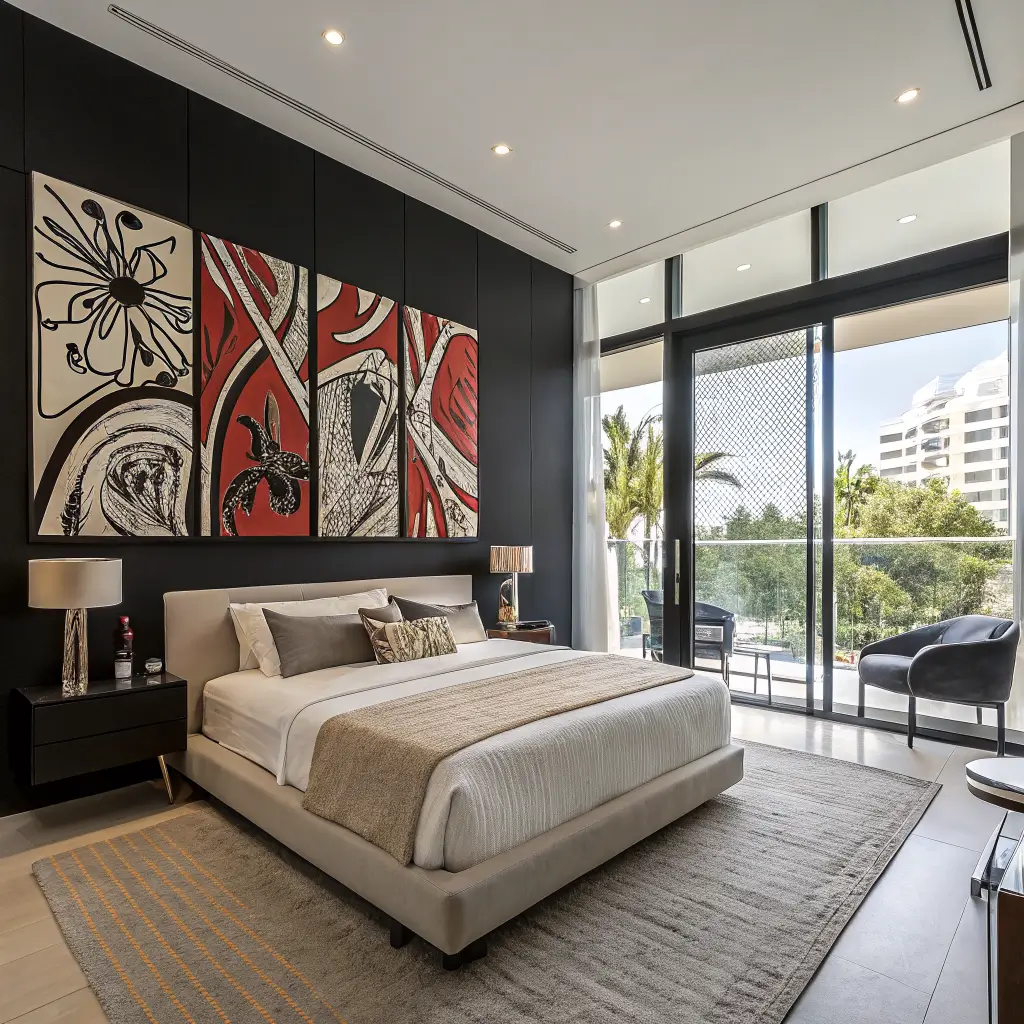 Last but definitely not least โ the black wall with bold artwork approach. This is for anyone who wants their bedroom to feel like a personal gallery. A black accent wall acts as the ultimate backdrop for art because it eliminates visual noise and forces every piece to command attention.