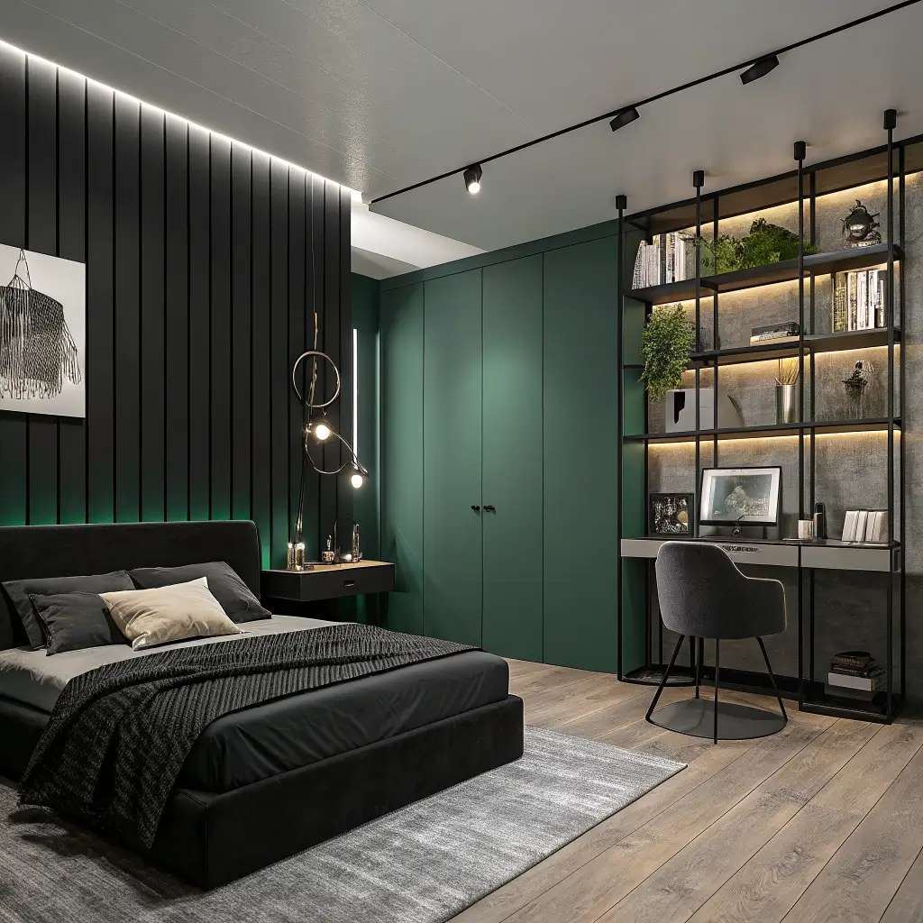 Start with crisp white or light grey walls, then add furniture in pure black with minimal ornamentation. The emerald comes through in carefully chosen pieces: a statement chair, geometric artwork, or bedding in that perfect jewel tone. Every green element should feel intentional, not scattered.