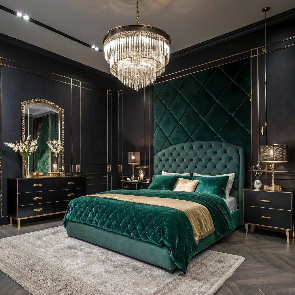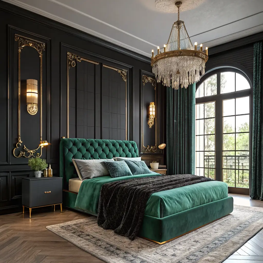 Mix black lacquered furniture with emerald green velvet everything. We’re talking tufted headboard, ottoman at the foot of the bed, maybe even curtains if you’re feeling extra. Add mirrors everywhere – black frames, naturally – to bounce light and make all that velvet shimmer. Metallic accents in gold or silver bridge the gap between black and green beautifully.