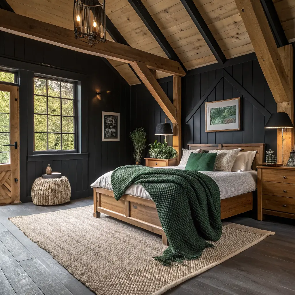 Let’s end with maximum coziness – the woodland retreat that makes you never want to leave bed. This style takes cabin comfort and adds sophisticated black elements that elevate it beyond basic rustic.
