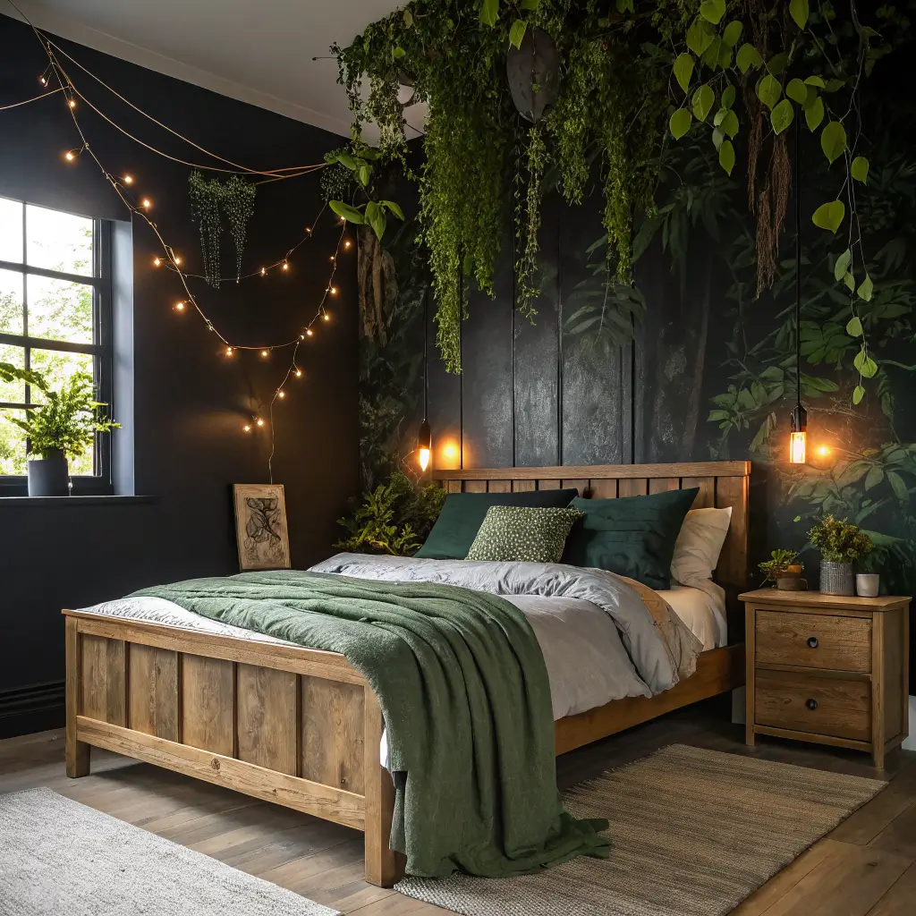 Layer multiple shades of green through textiles: sage sheets, forest green duvet, olive throw pillows. Add black through furniture and frames, but choose pieces with softer lines – nothing too angular or harsh. The goal is creating a space that feels like a luxury treehouse.