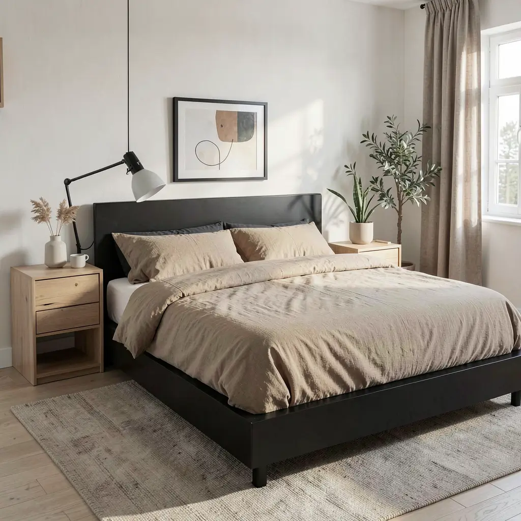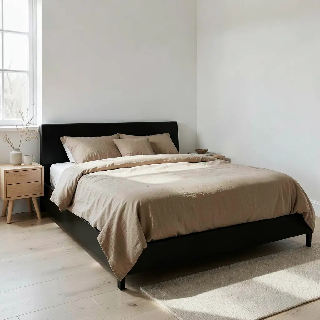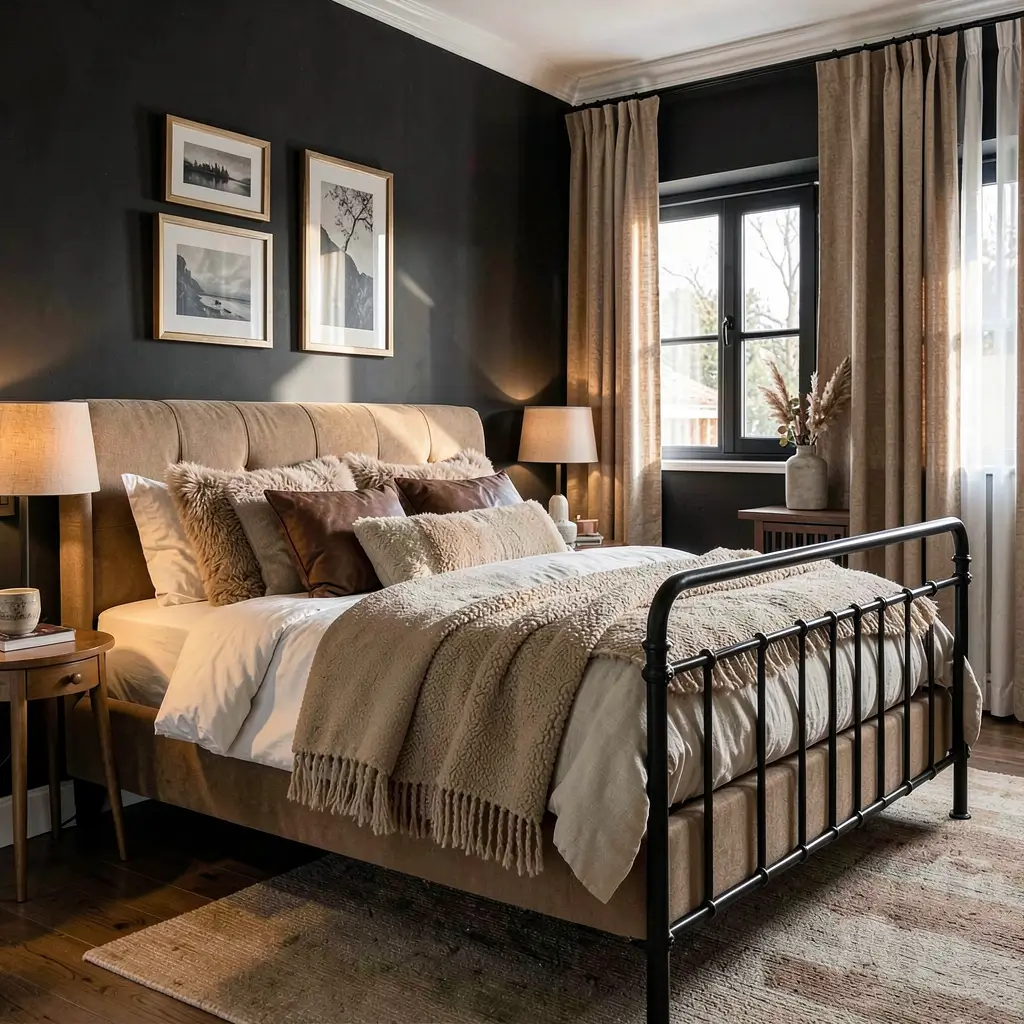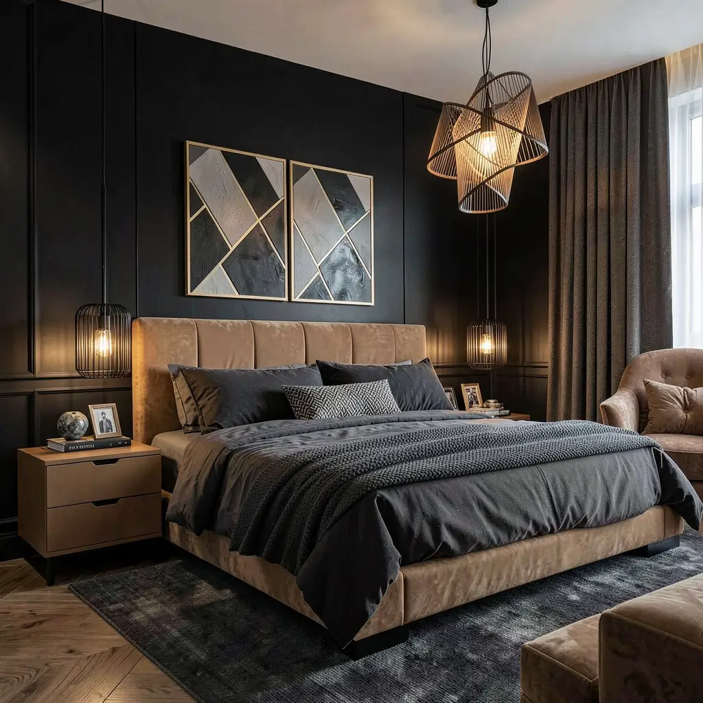 A warm sanctuary balances black’s drama with tan’s natural warmth to create the perfect comfort zone. This approach makes your bedroom feel like a hug at the end of a long day.