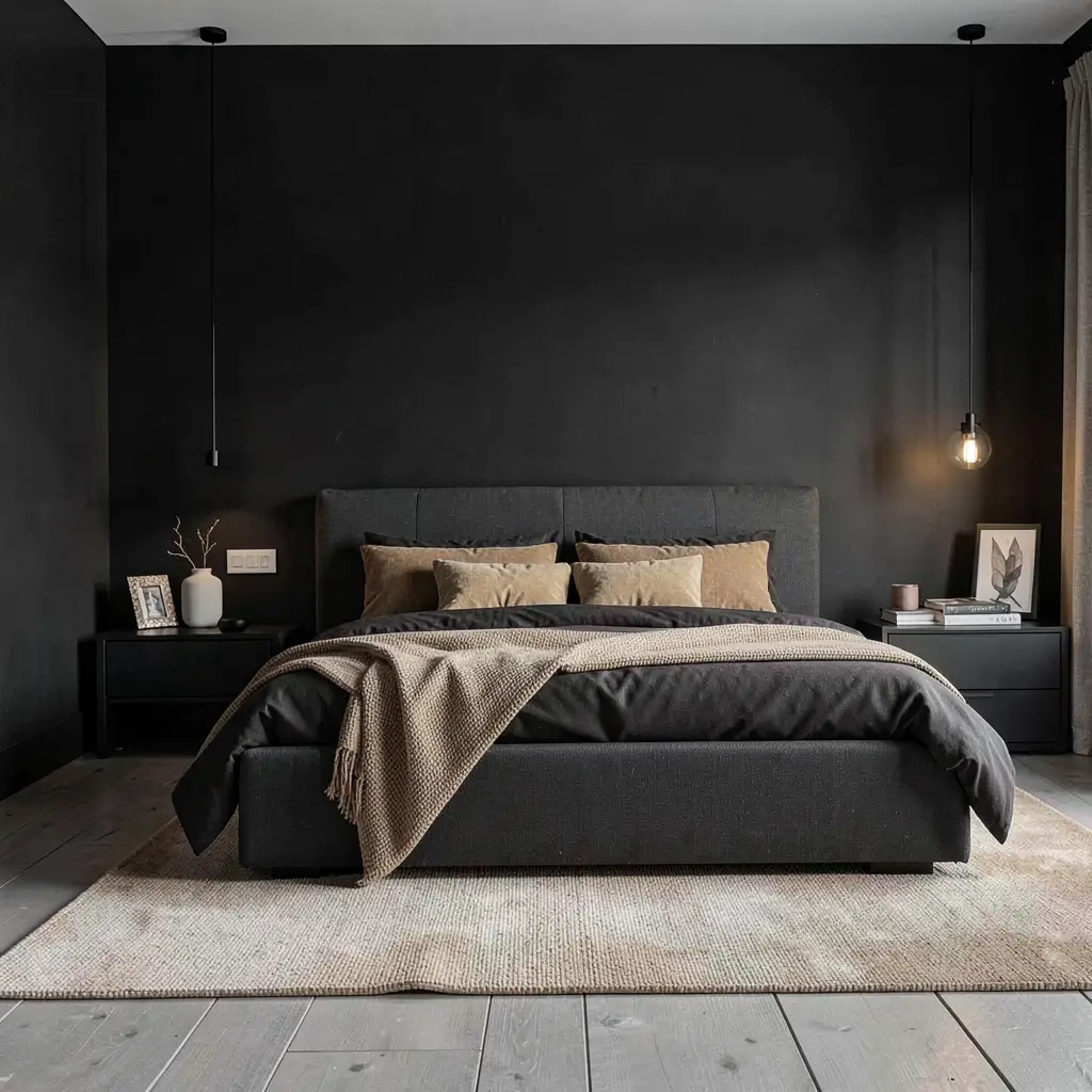 Strategic tan accents in a black bedroom create pockets of coziness that draw you in. This approach lets black dominate while tan softens the edges.