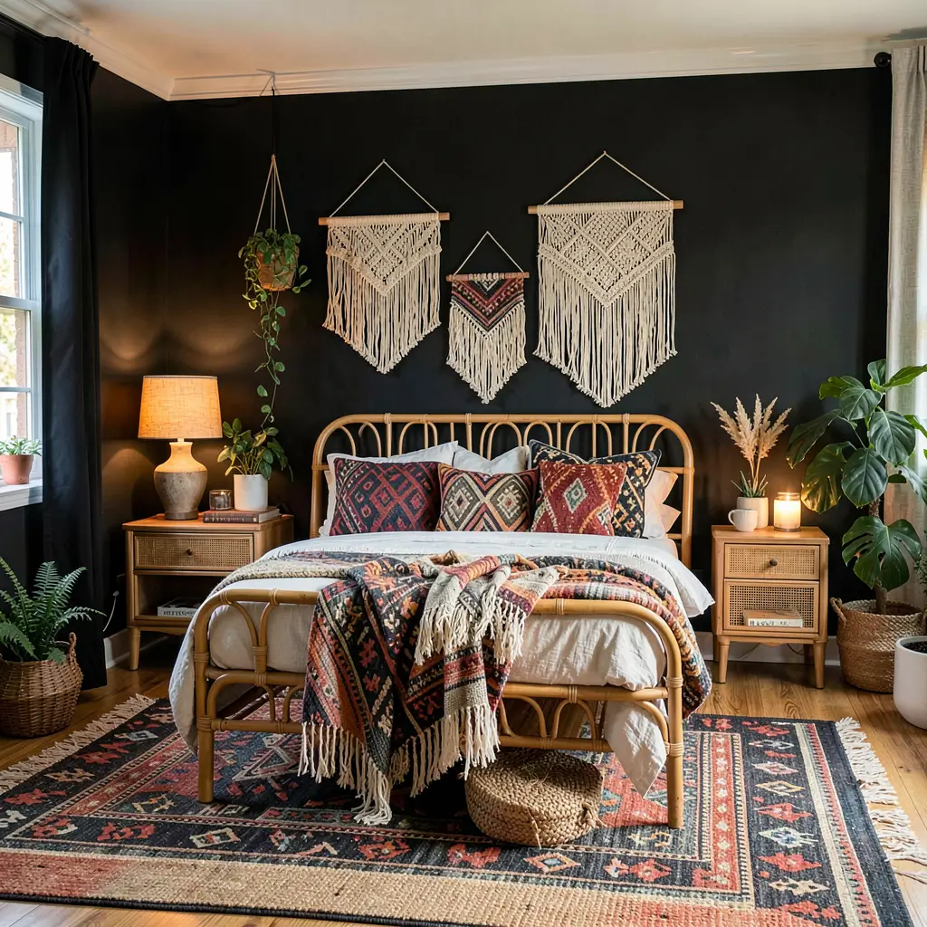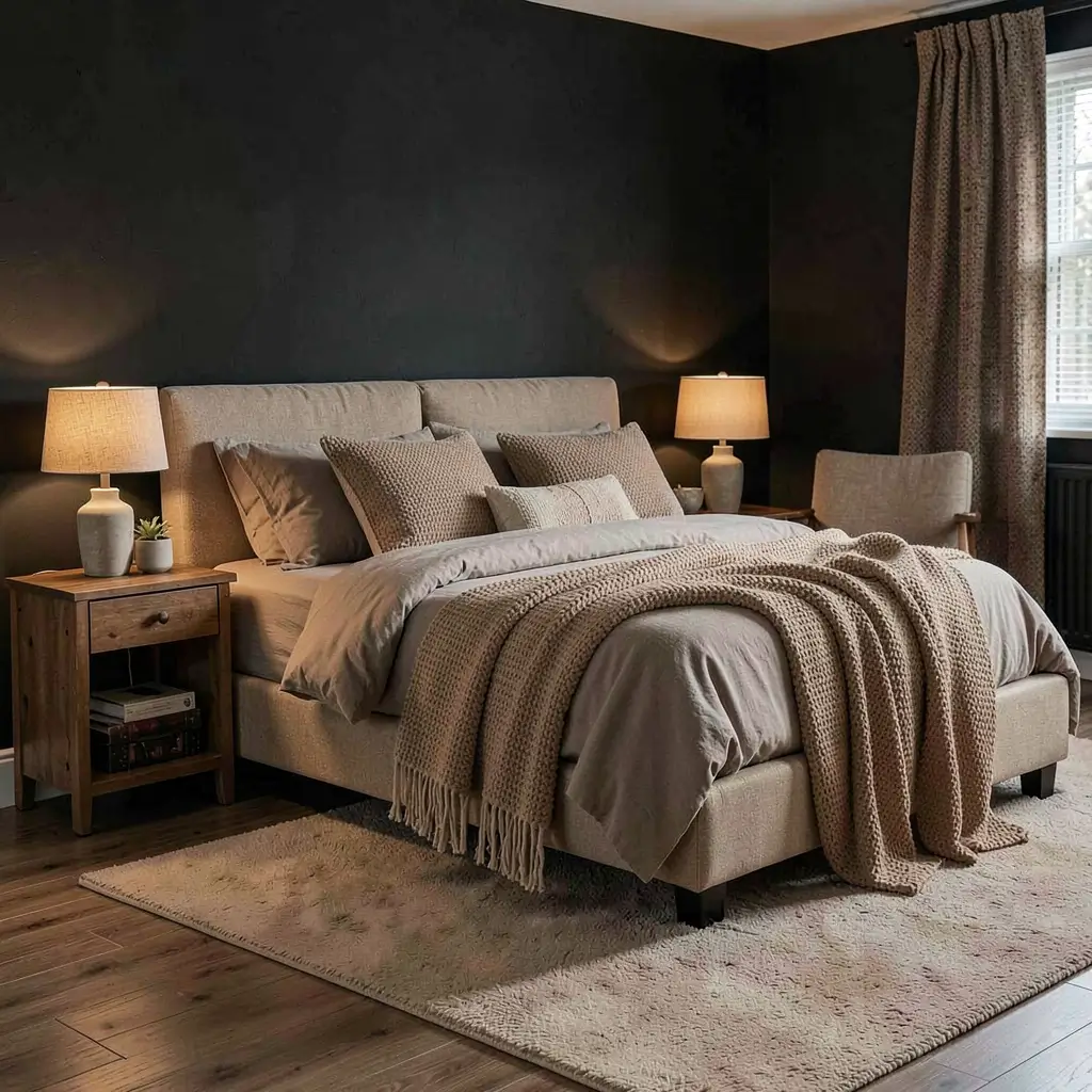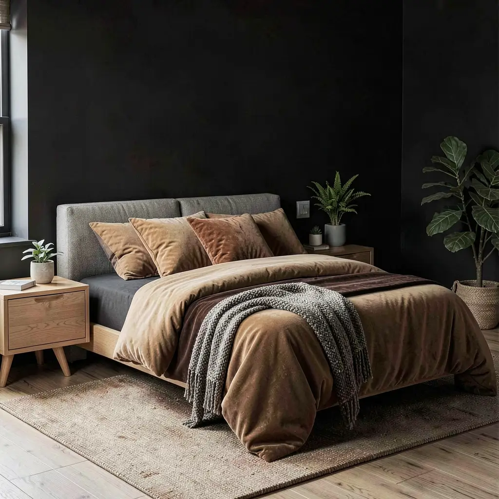 Black walls with tan textures create visual interest through touch rather than color. This combination turned my flat, boring bedroom into something magazine-worthy.