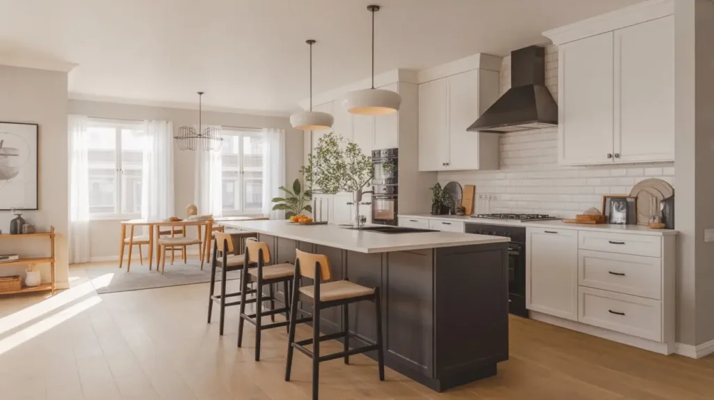 Open-concept kitchens demand a cohesive design because the kitchen flows directly into your living space. Black and white works brilliantly here because it creates definition without walls.