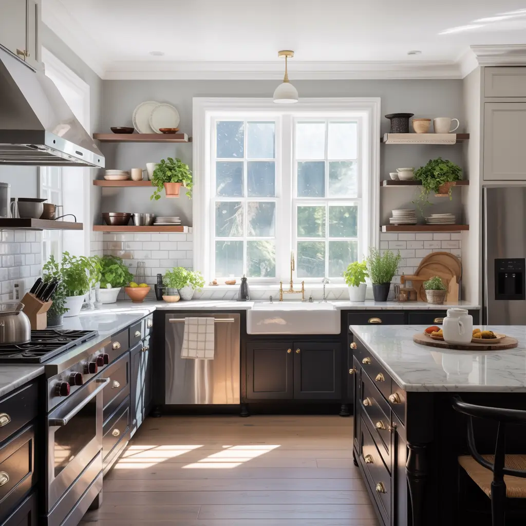 Transitional kitchens blend elements from different styles to create something balanced and livable. You might have Shaker-style cabinets (traditional) but in a stark black and white palette (modern). Or sleek hardware on raised-panel doors. It’s all about mixing and matching thoughtfully.
