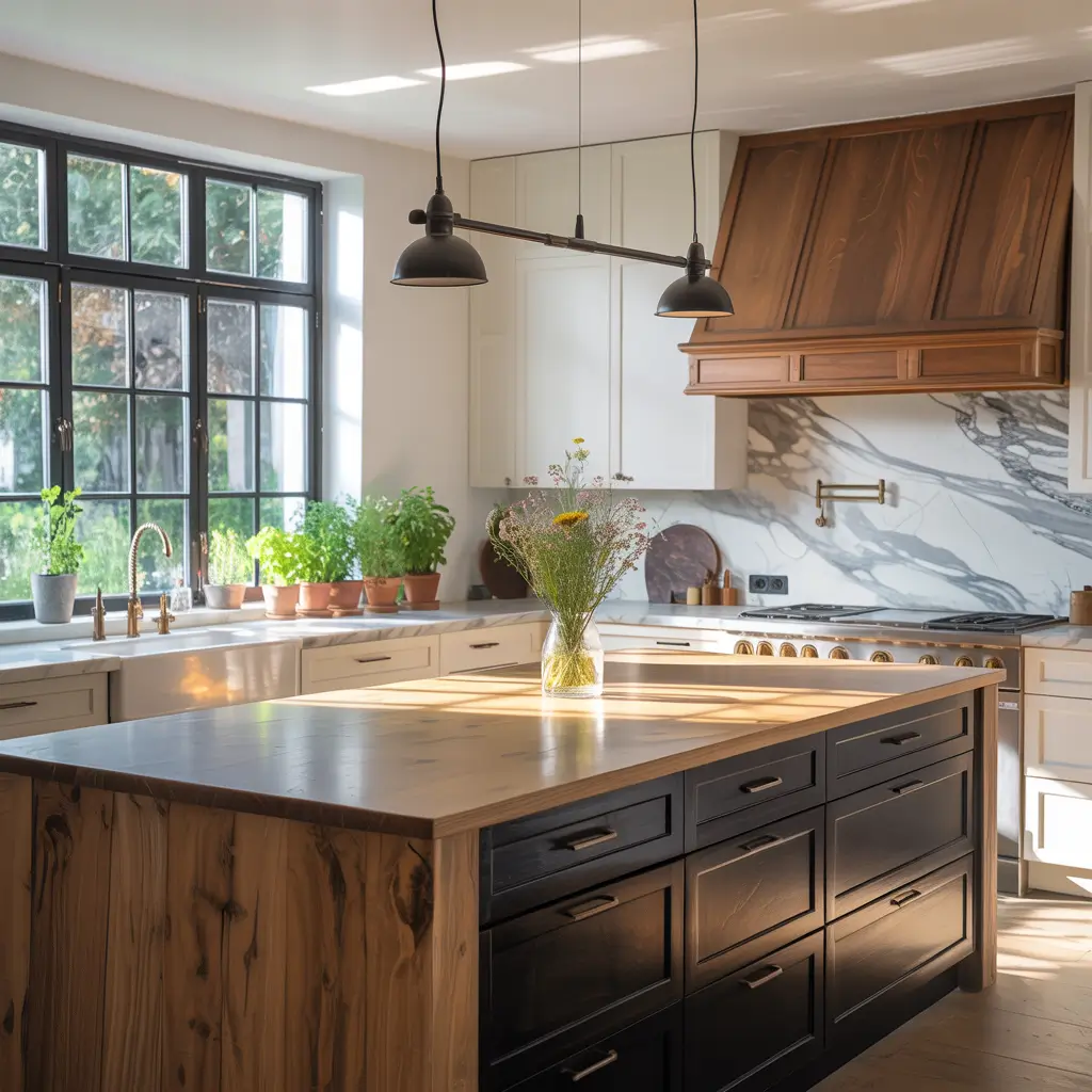 Here’s where things get really interesting. Mixing materials in your black and white kitchen adds texture, depth, and personality that a single-material kitchen just can’t match.
