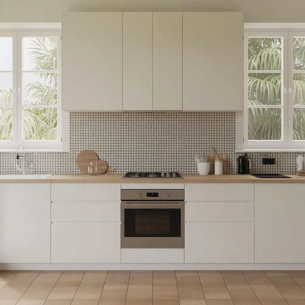 The minimalist mindset means your cabinets, counters, and hardware should be clean-lined and simple. Let the mosaic do the talking. Think sleek handleless cabinets, minimal open shelving, and matte or honed finishes rather than high-gloss everything.