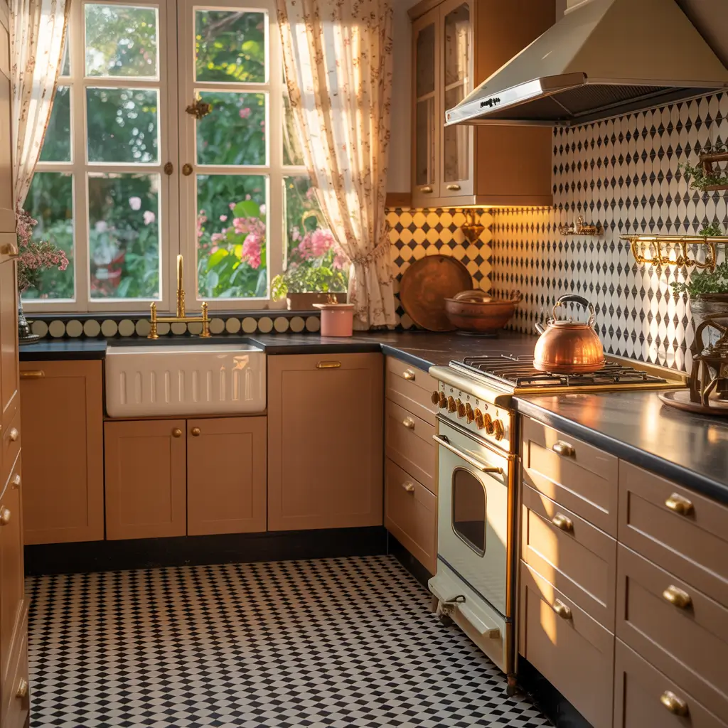 The trick with checkerboard patterns? Don’t overthink the rest of your kitchen. Let the floor be the star of the show. Pair it with neutral cabinets, simple hardware, and minimal accessories. When you’ve got that much going on underfoot, you want your countertops and walls to breathe a little.