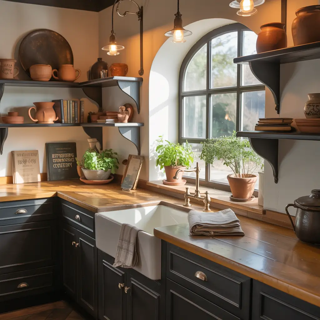 I’m talking about reclaimed wood beams, distressed finishes, and black wrought-iron fixtures that look like they’ve survived a century or two. The wood should have character—knots, grain variations, maybe even some weathering. Pair that with matte black or charcoal cabinetry, and you’ve got yourself a space that tells a story.