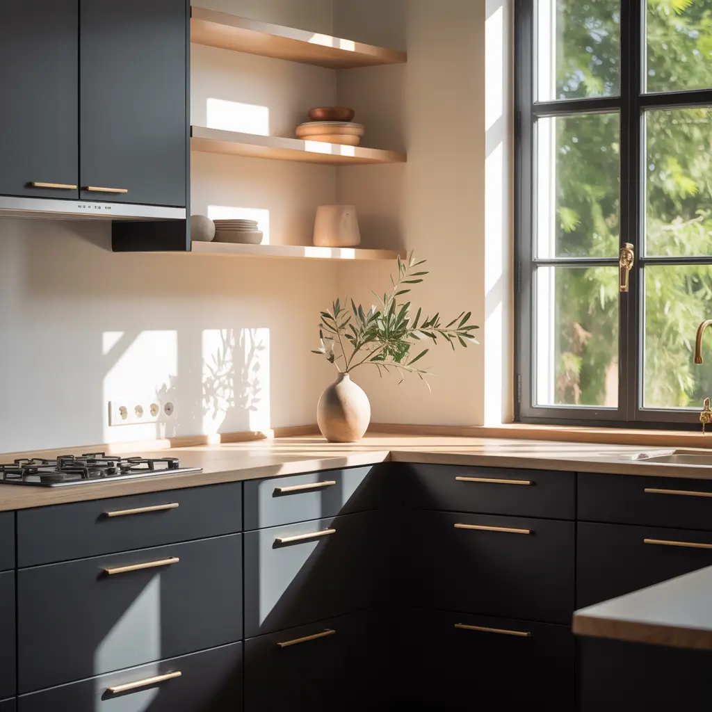 The key here is contrast and clean lines. Picture sleek black cabinetry paired with light oak or ash wood floating shelves. The black grounds the space while the wood softens those hard edges. I recently helped my sister redo her kitchen using matte black lower cabinets and leaving the upper cabinets as open shelving with thick walnut planks. The transformation? Chef’s kiss.