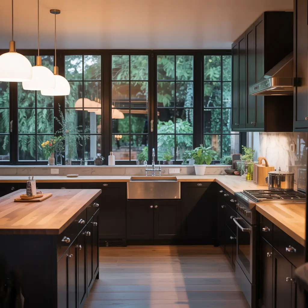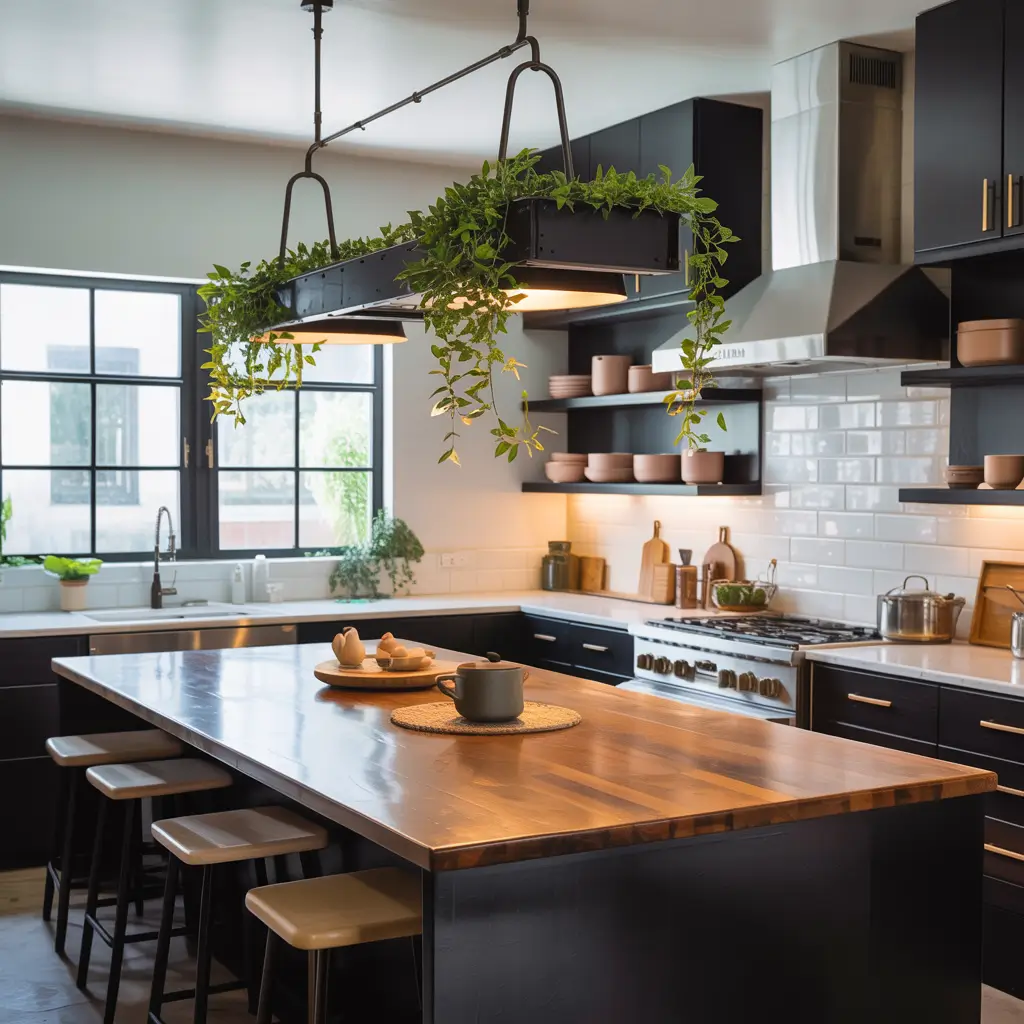 Also, don’t underestimate the power of statement lighting. A beautiful black and wood chandelier or a series of industrial-style black pendants with wood accents can become the focal point of your entire kitchen. They’re functional art, basically.