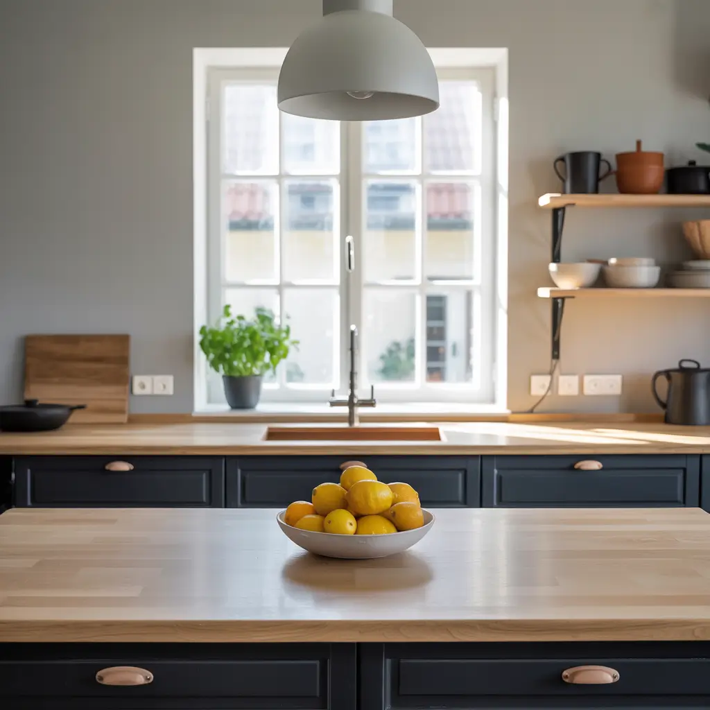 The Scandinavian palette differs from rustic or farmhouse styles because it stays lighter and more airy. You’ll see more blonde woods like birch, ash, and light oak paired with black accents rather than fully black cabinets. The black appears in strategic doses—hardware, fixtures, chair frames, light pendants.
