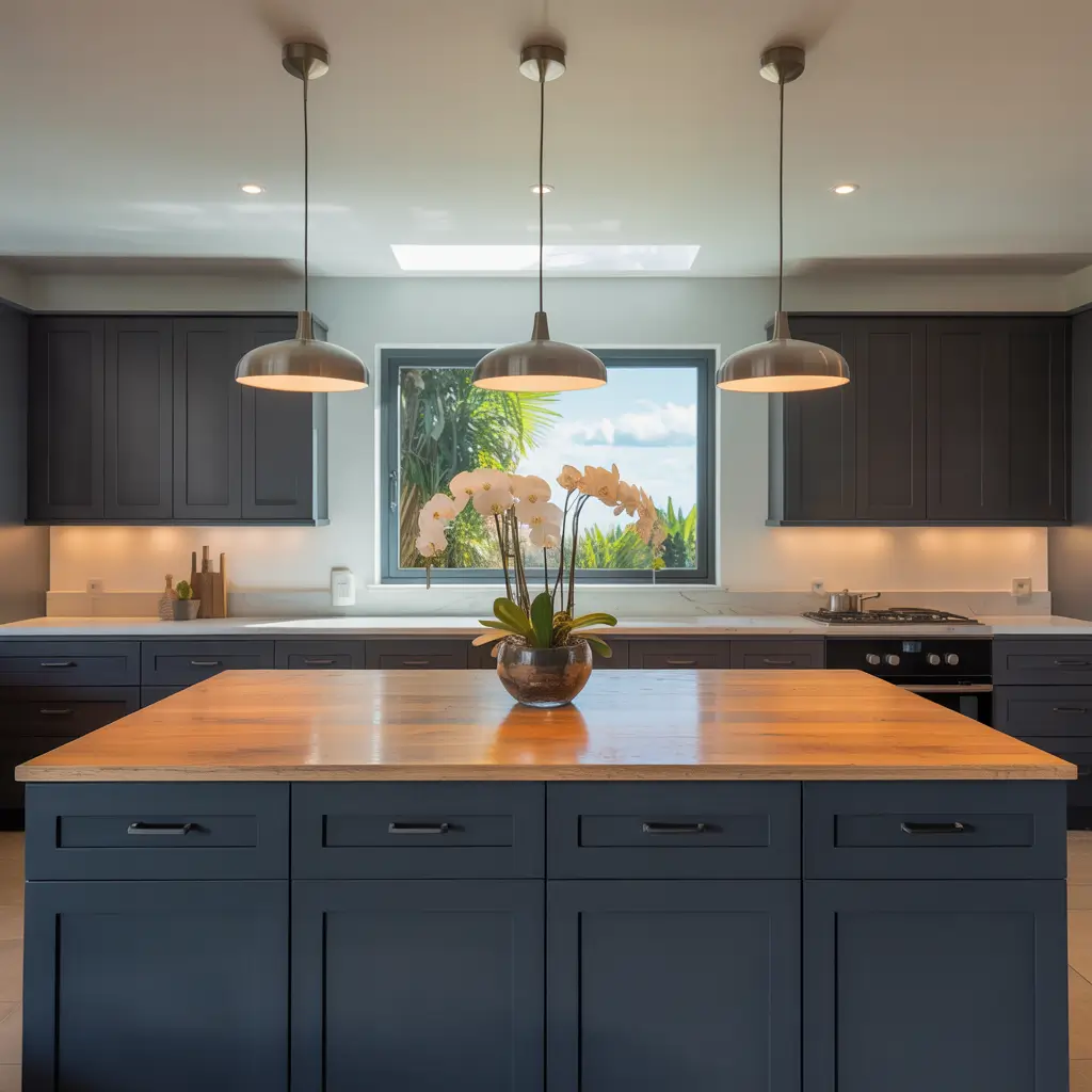 - Contrasting island: wood when cabinets are black, or black when cabinets are wood