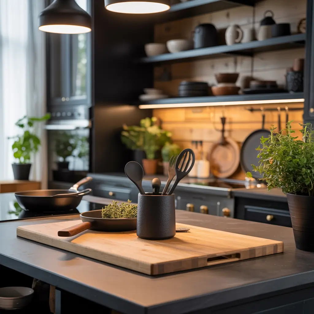 I’m currently mildly obsessed with those thick, end-grain walnut cutting boards that you can leave out on the counter. They’re functional, beautiful, and add that warm wood element even if the rest of your kitchen is mostly black. Plus, they make you feel like a fancy chef even when you’re just making scrambled eggs.