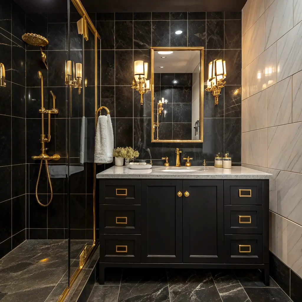 Okay, now we’re getting into serious luxury territory. Black tiles paired with gold accents creates this Art Deco-inspired glamour that makes you feel fancy every time you brush your teeth. I saw this combination in a designer showroom, and I’ve been plotting my master bath renovation ever since.