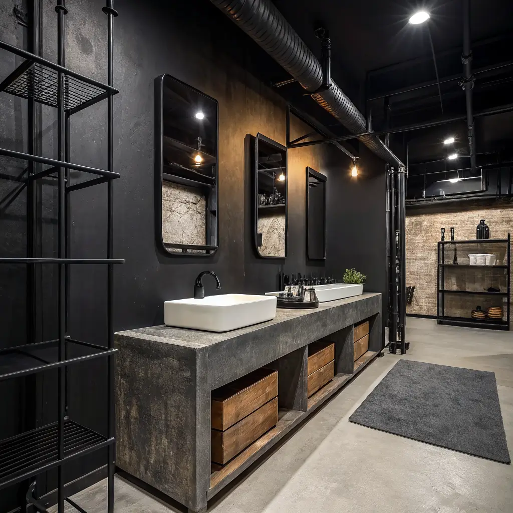 Lighting choices: Industrial-style Edison bulb fixtures, black metal cage lights, or factory-inspired pendant lights complete the look. We hung two large pendant lights over the vanity with visible Edison bulbs—functional and absolutely perfect for the industrial vibe.