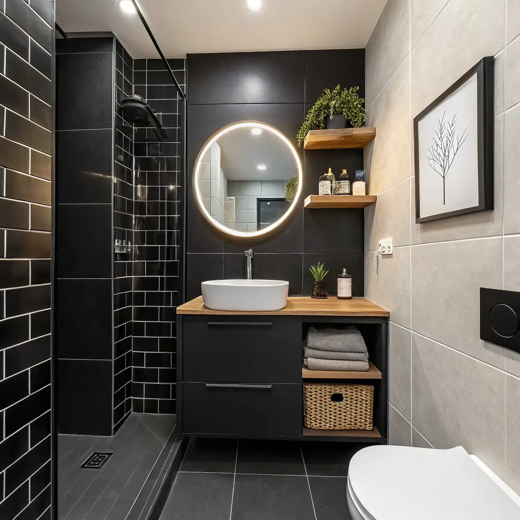 Lighting is non-negotiable: Small black bathrooms absolutely require layered, bright lighting. I install recessed ceiling lights, sconces on both sides of the mirror, and under-cabinet lighting. You cannot skimp here—inadequate lighting will make a small black bathroom feel like a dungeon.