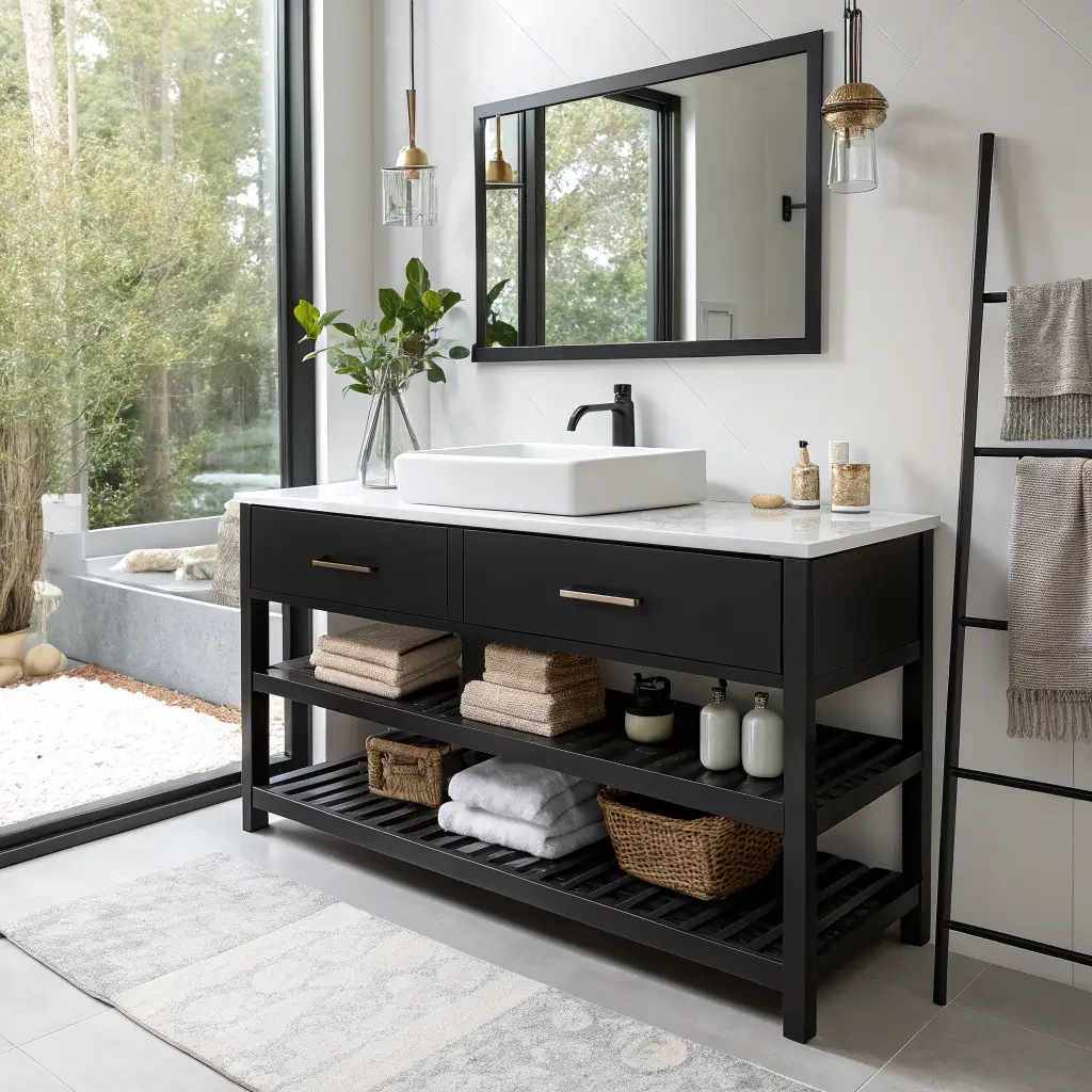 - Black shelves matching the vanity – Cohesive and monochromatic