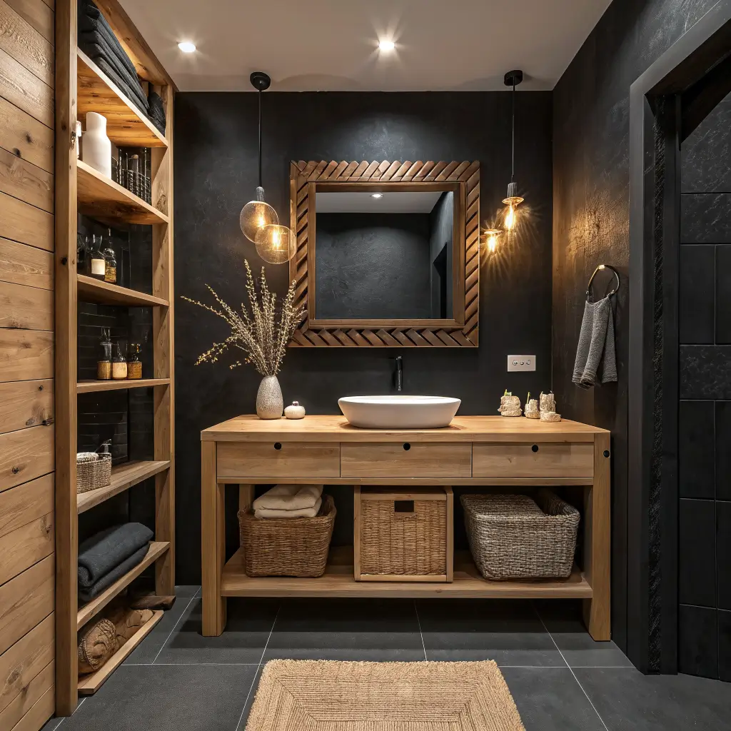 Maintenance considerations: Wood in bathrooms requires proper sealing to handle moisture. I sealed my wood vanity and shelving with water-resistant products and wipe up water promptly. The combination requires regular cleaning—black shows water spots, wood needs occasional conditioning—but the beauty justifies the maintenance, IMO.