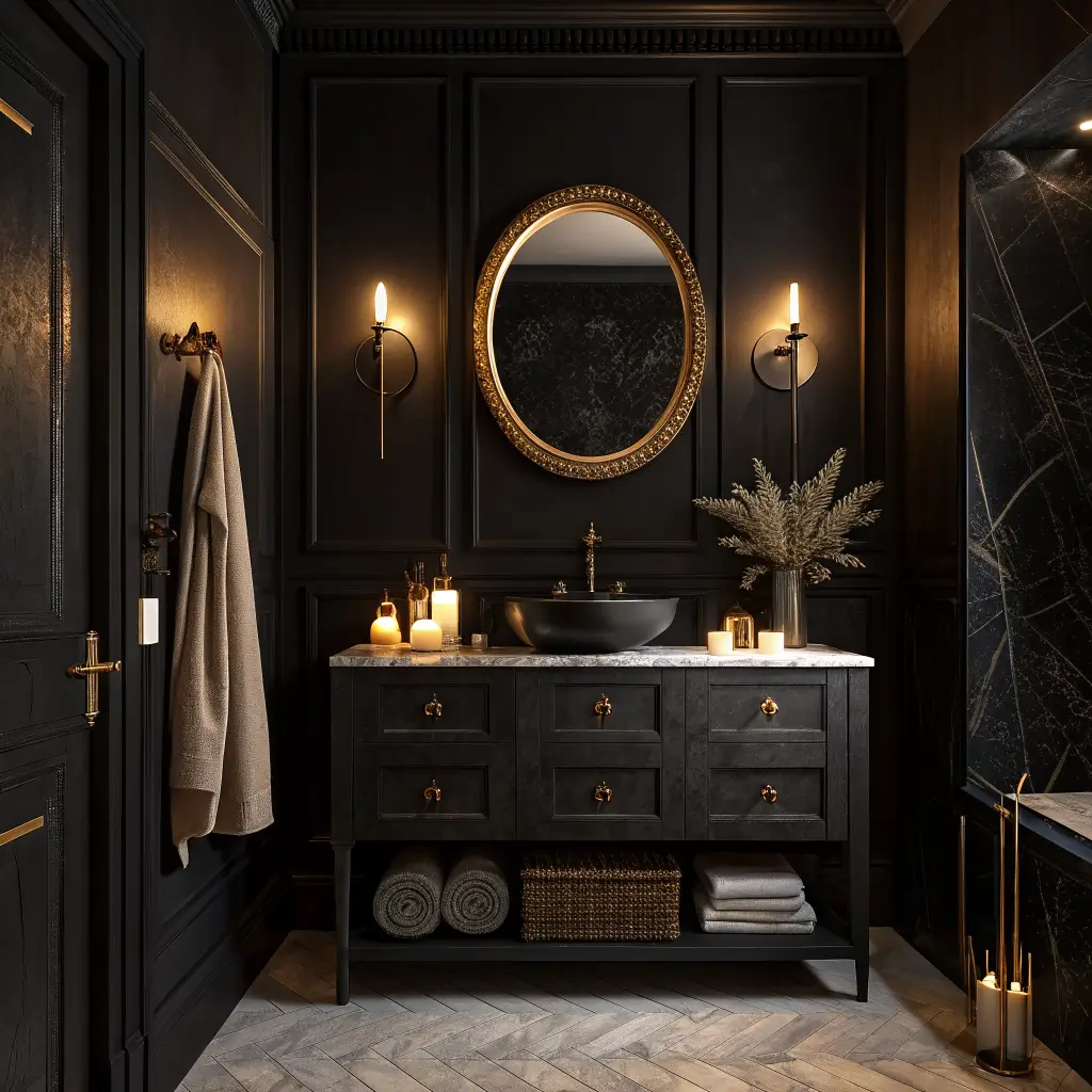 Wall color and finish: Matte black walls absorb light and create depth. I’ve also used deep charcoal or very dark navy that reads as black in dim lighting but has more dimension. Avoid glossy finishes in moody bathrooms—the reflections disrupt the atmosphere you’re creating.