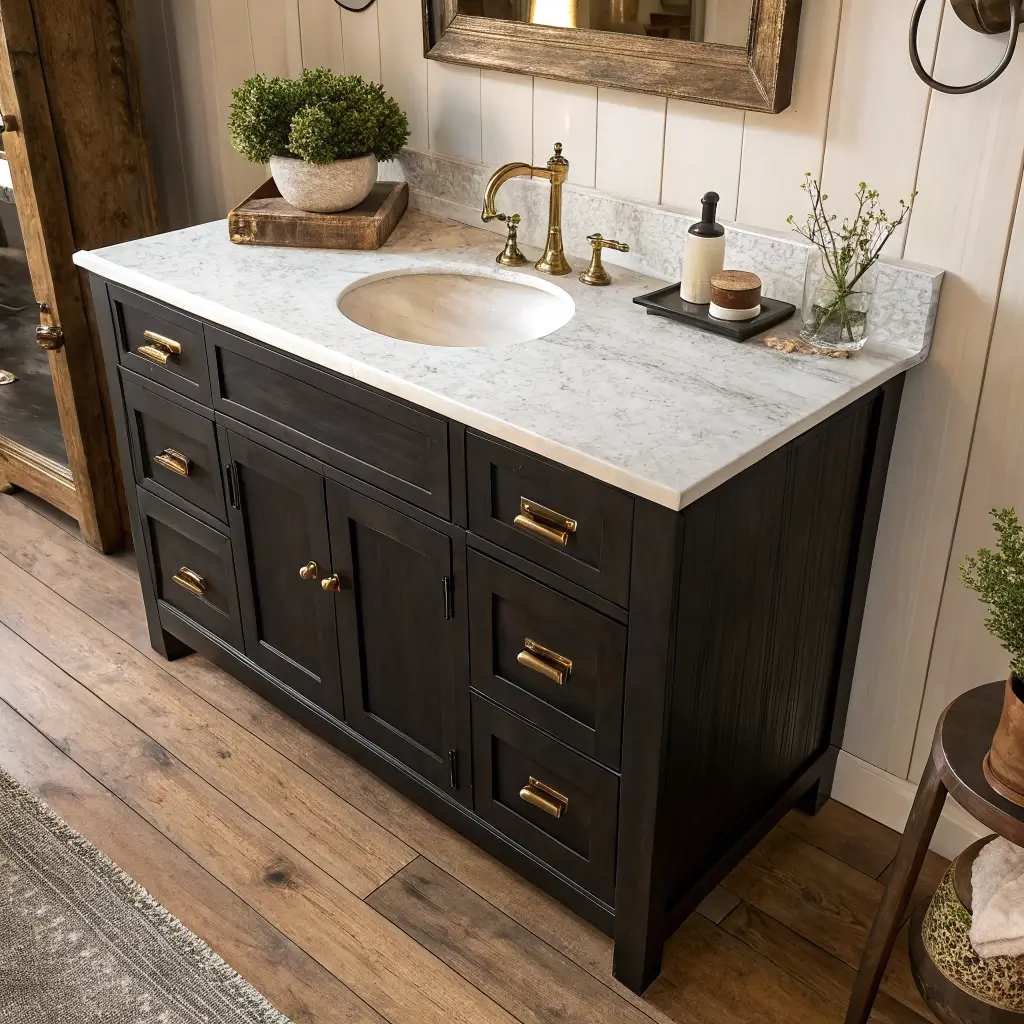 Now here’s where things get cozy. A farmhouse-style black wood vanity with brass handles brings warmth and character that modern styles sometimes lack. Think reclaimed wood textures, shaker-style cabinet doors, and those gorgeous antique brass pulls that catch the light just right.