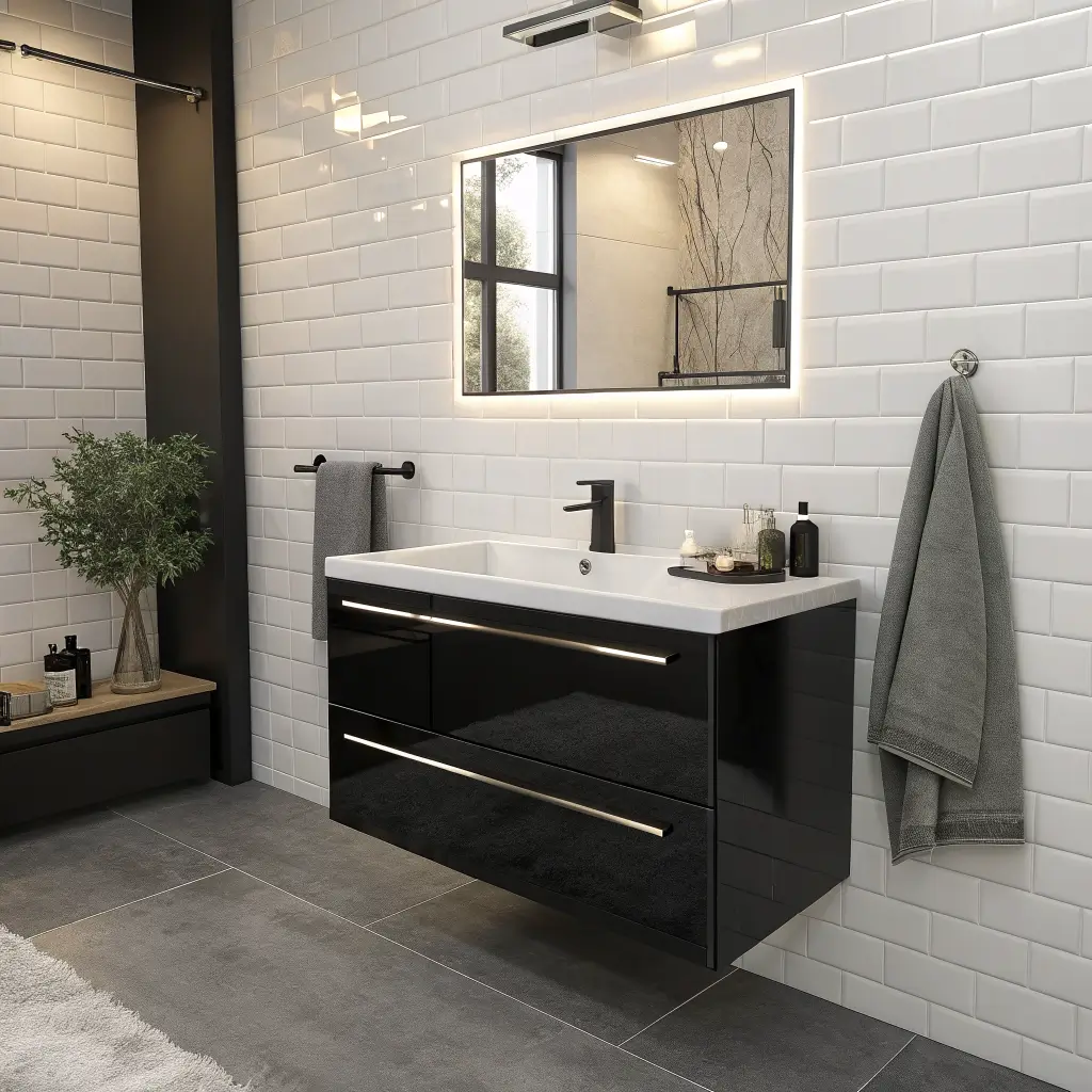 A glossy black minimalist vanity reflects light and creates depth in your bathroom. It acts almost like a mirror, bouncing light around the room and making surfaces feel more dynamic. This style works particularly well in bathrooms with plenty of natural light or well-placed LED fixtures.