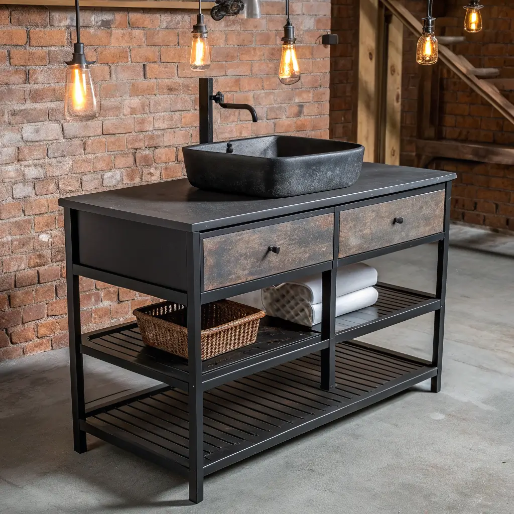 Industrial design celebrates the beauty of construction materials rather than hiding them. A black powder-coated metal frame with an open structure gives your bathroom an edgy, urban feel. These vanities often pair metal frames with reclaimed wood shelves or concrete countertops for maximum effect.