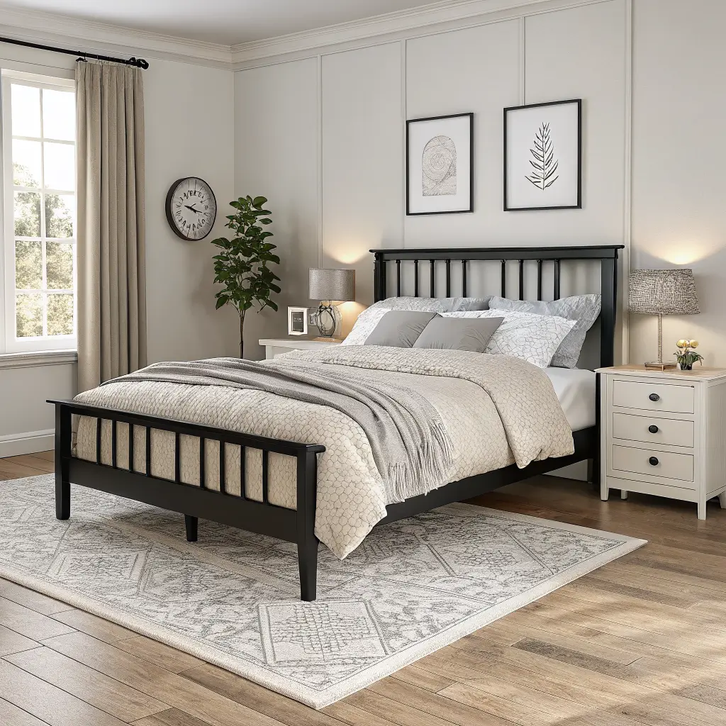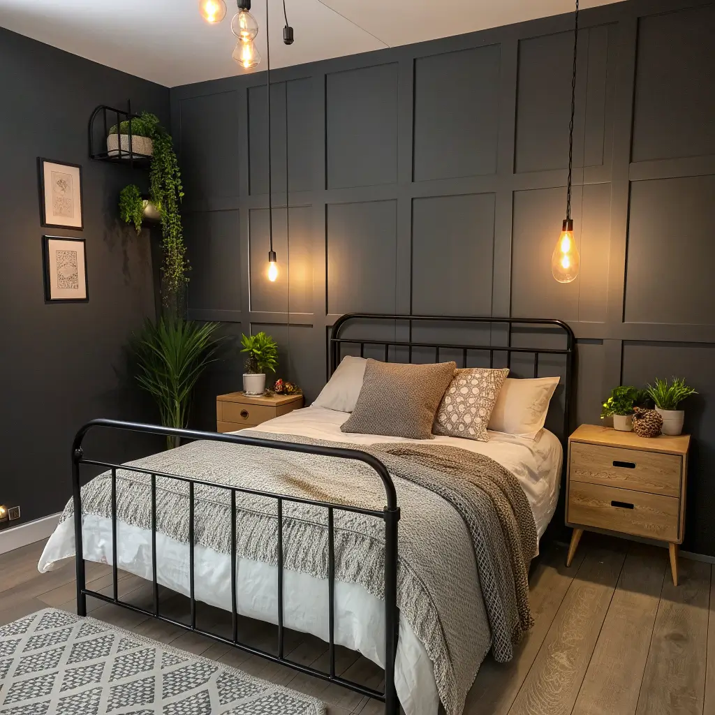 Add wood elements to warm up the black metal or wood frame. I have a reclaimed wood nightstand that looks amazing against my black iron bed frame. The contrast between industrial and natural makes the whole room feel balanced.